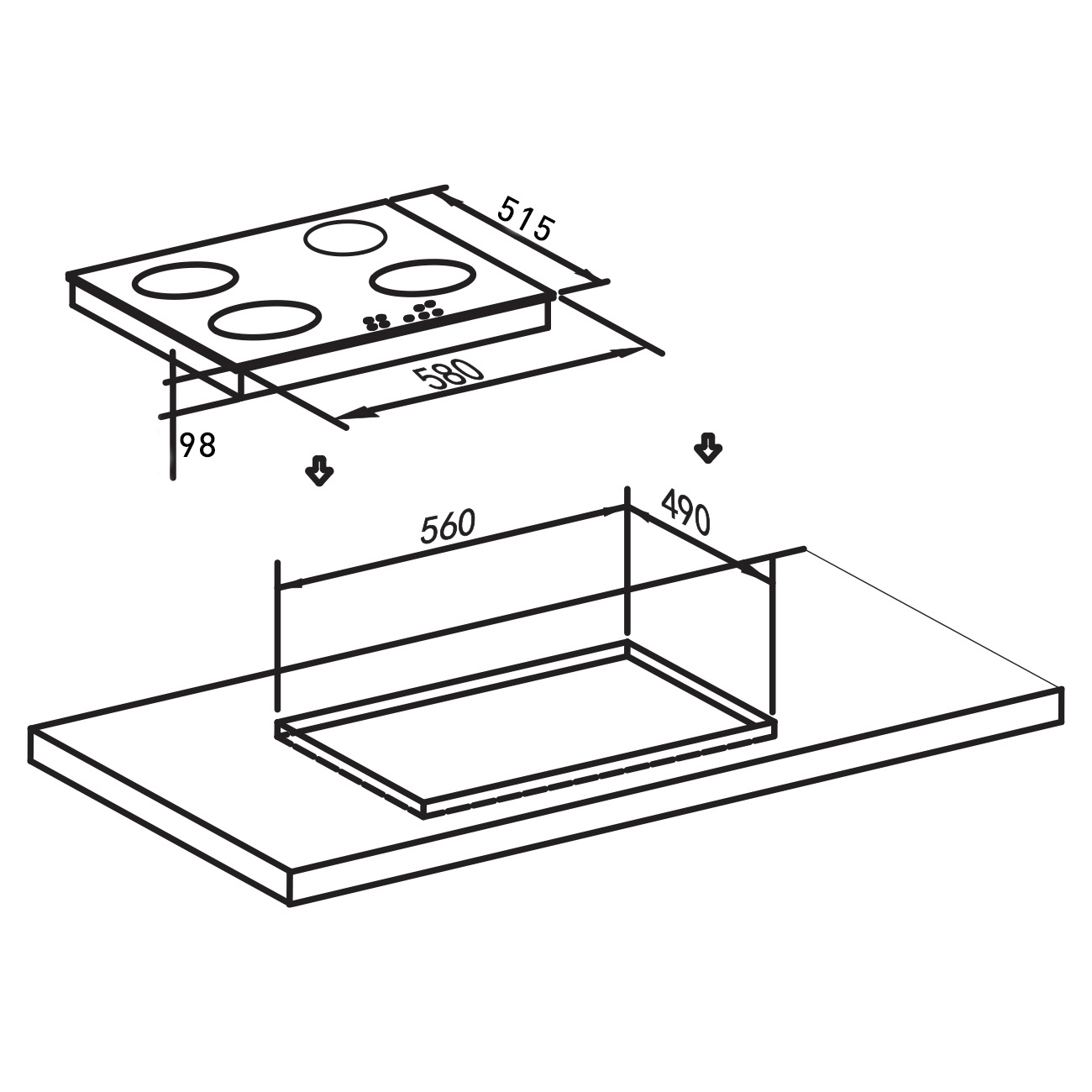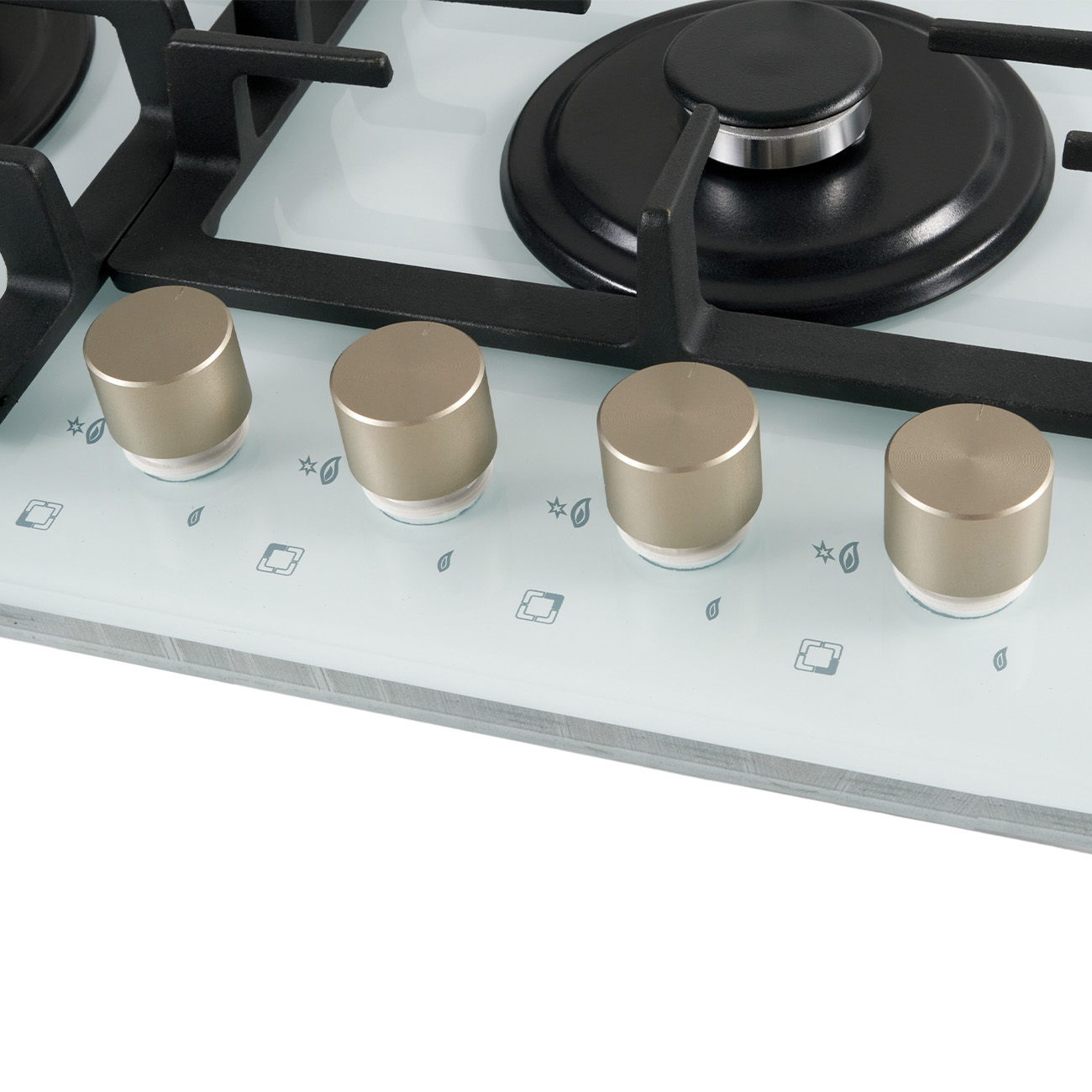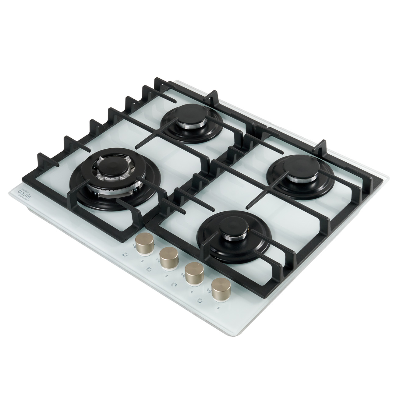 Описаниеповерхность газовая независимая, 60 см, газ на стекле, 4 конфорки, решетки чугунные, белый