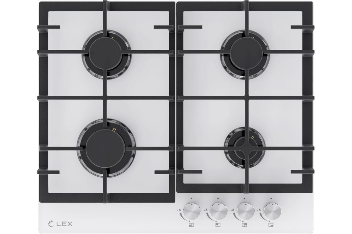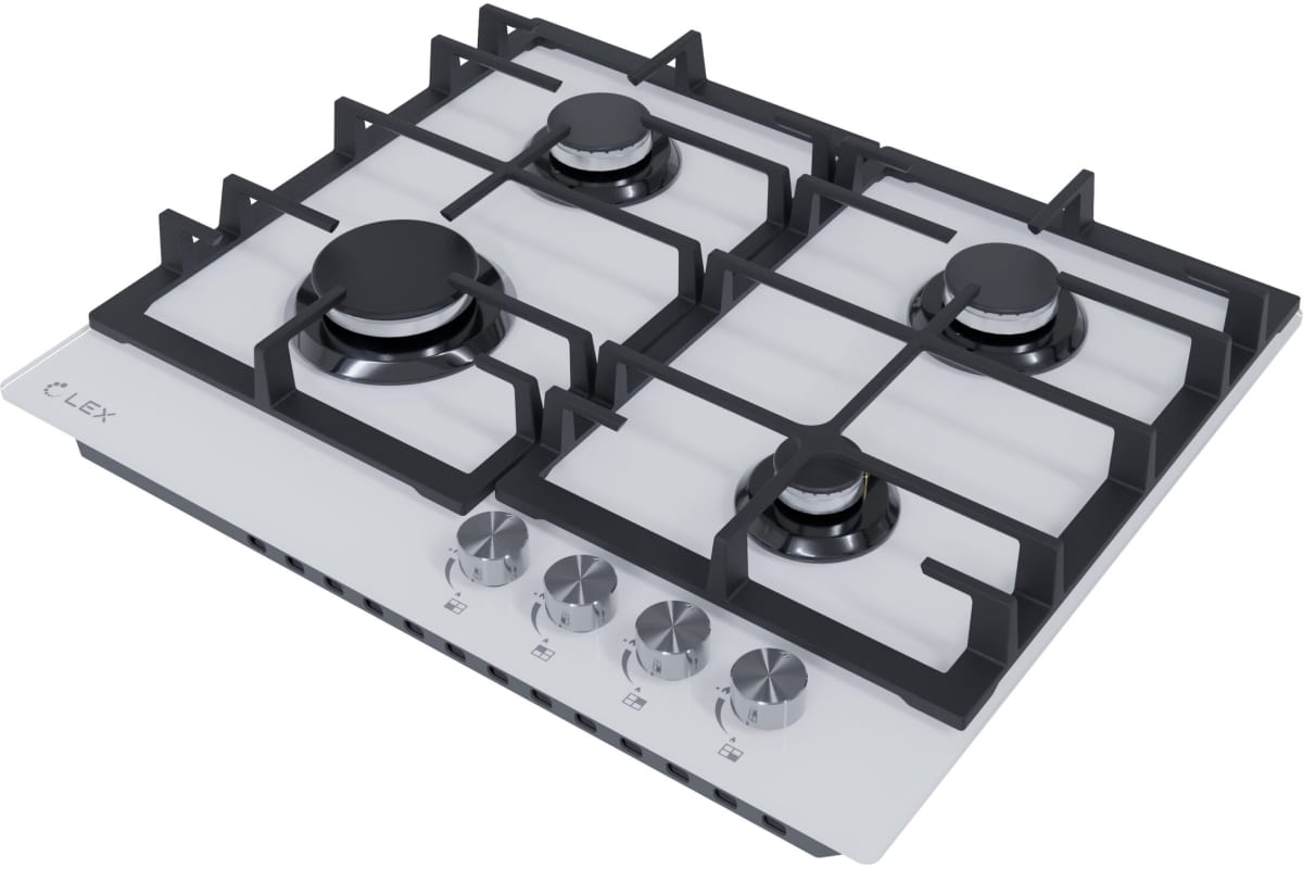 Описаниеповерхность газовая независимая, 60 см, газ на стекле, 4 конфорки, решетки чугунные, белый