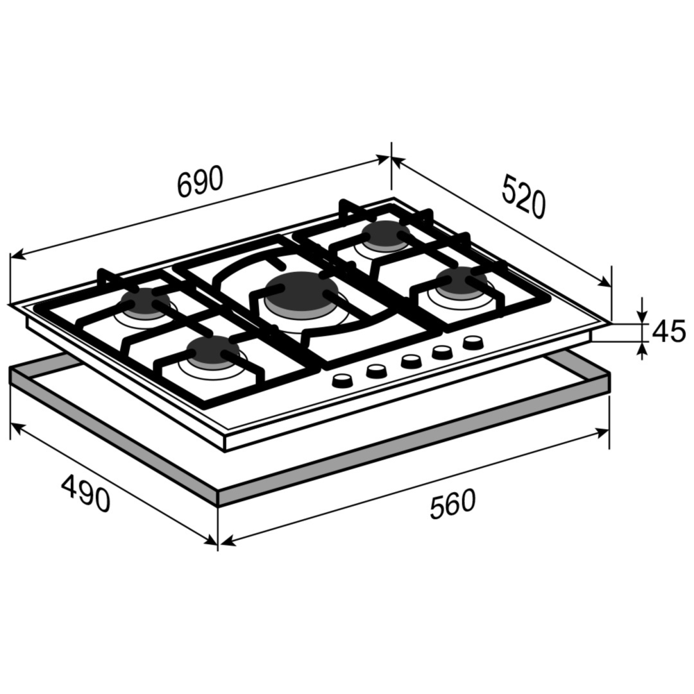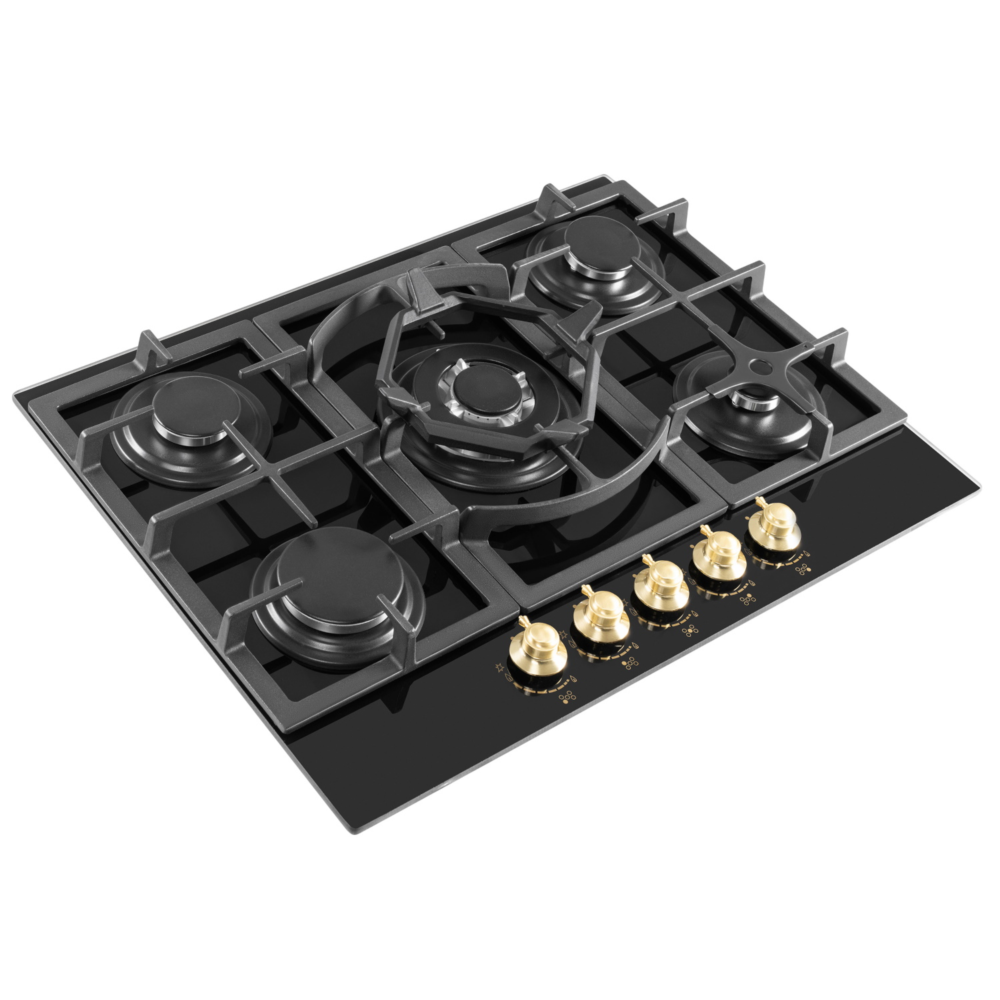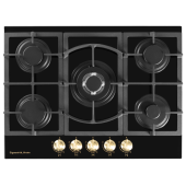 Описаниеповерхность газовая независимая, 70 см, газ на стекле, 5 конфорок, решетки чугунные, черный