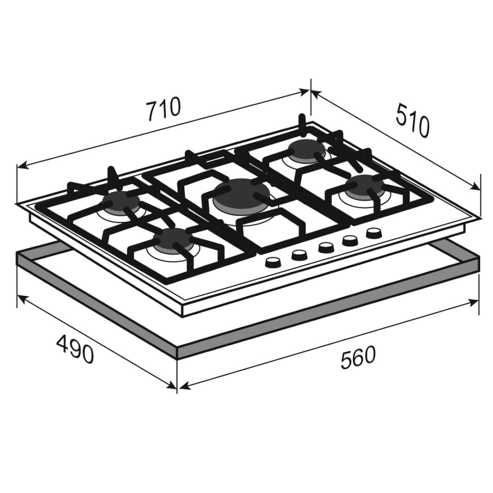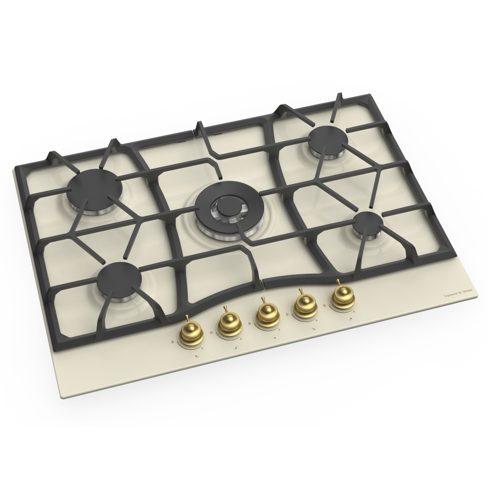 Описаниеповерхность газовая независимая, 70 см, газ на металле, 5 конфорок, решетки чугунные, бежевый