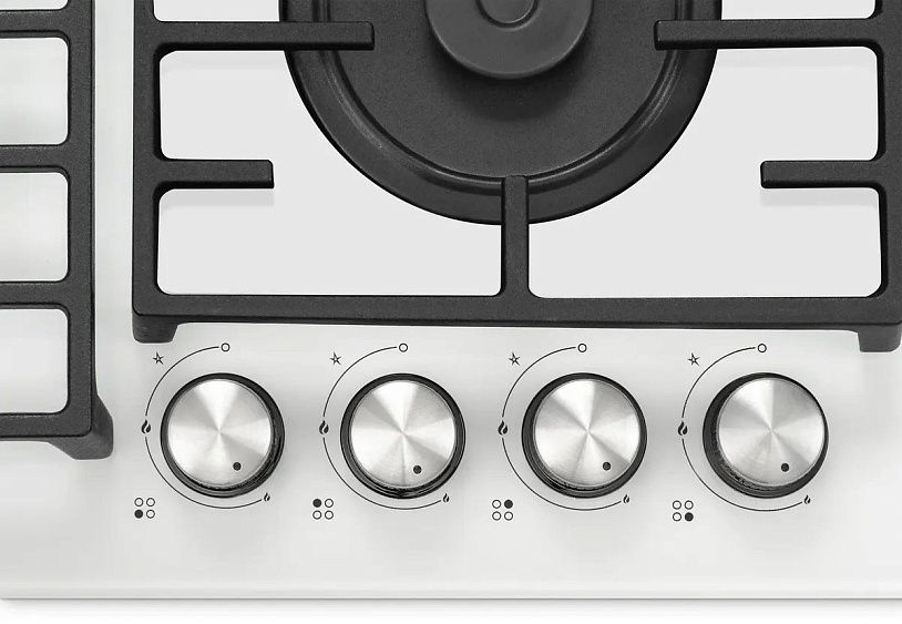 Описаниеповерхность газовая независимая, 60 см, газ на стекле, 4 конфорки, решетки чугунные, белый