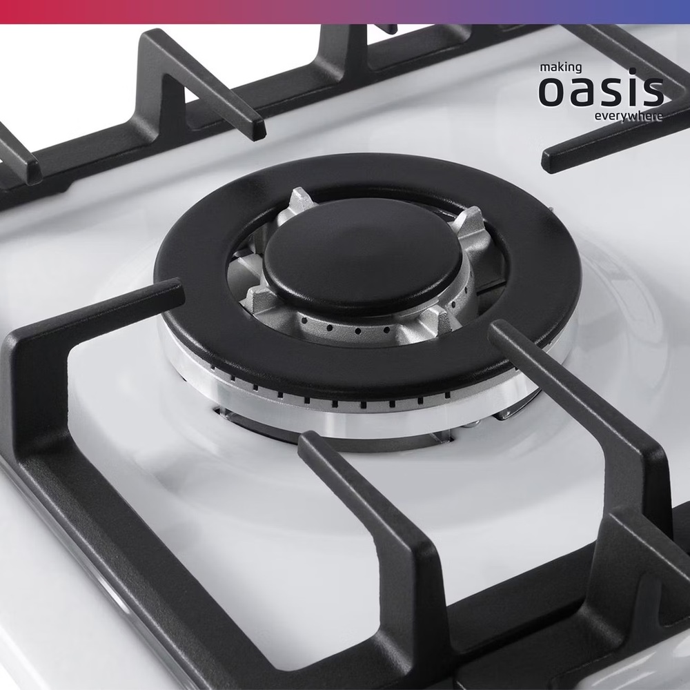 Описаниеповерхность газовая независимая, 60 см, газ на эмали, 4 конфорки, решетки чугунные, белый