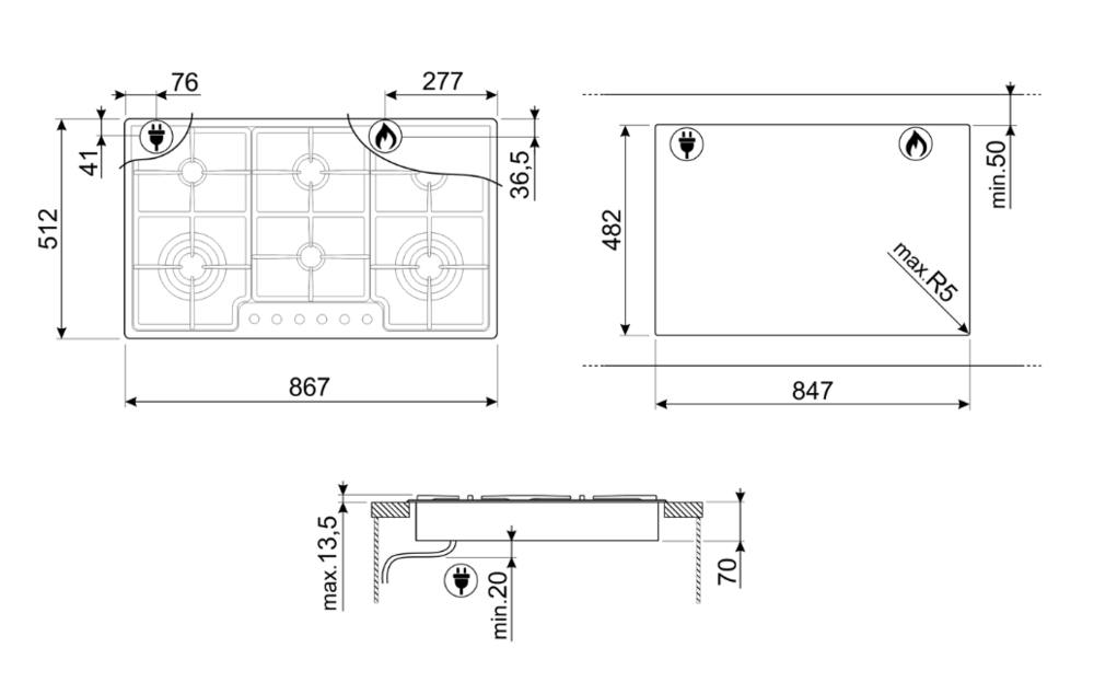 Описаниеповерхность газовая независимая, 90 см, газ на металле, 6 конфорок, решетки чугунные, нержавеющая сталь