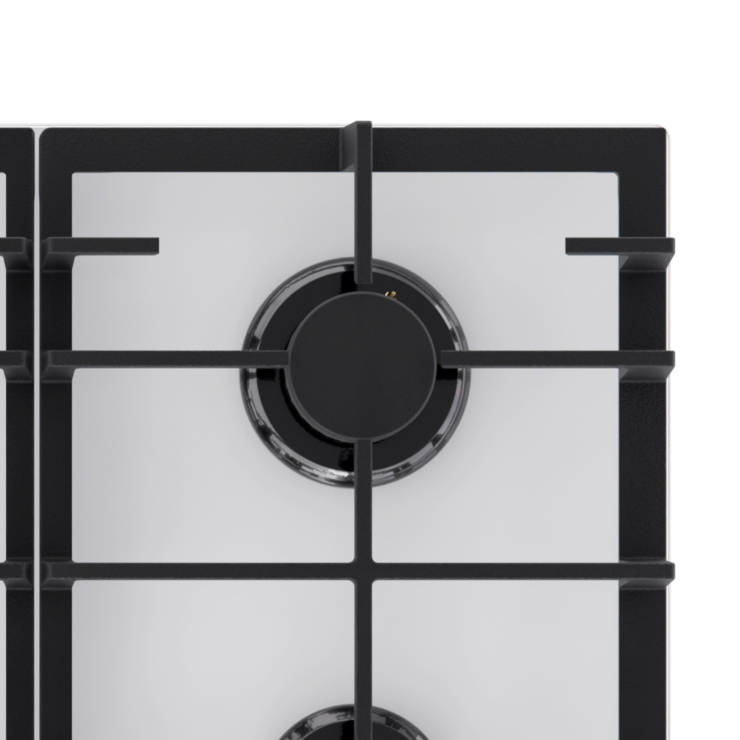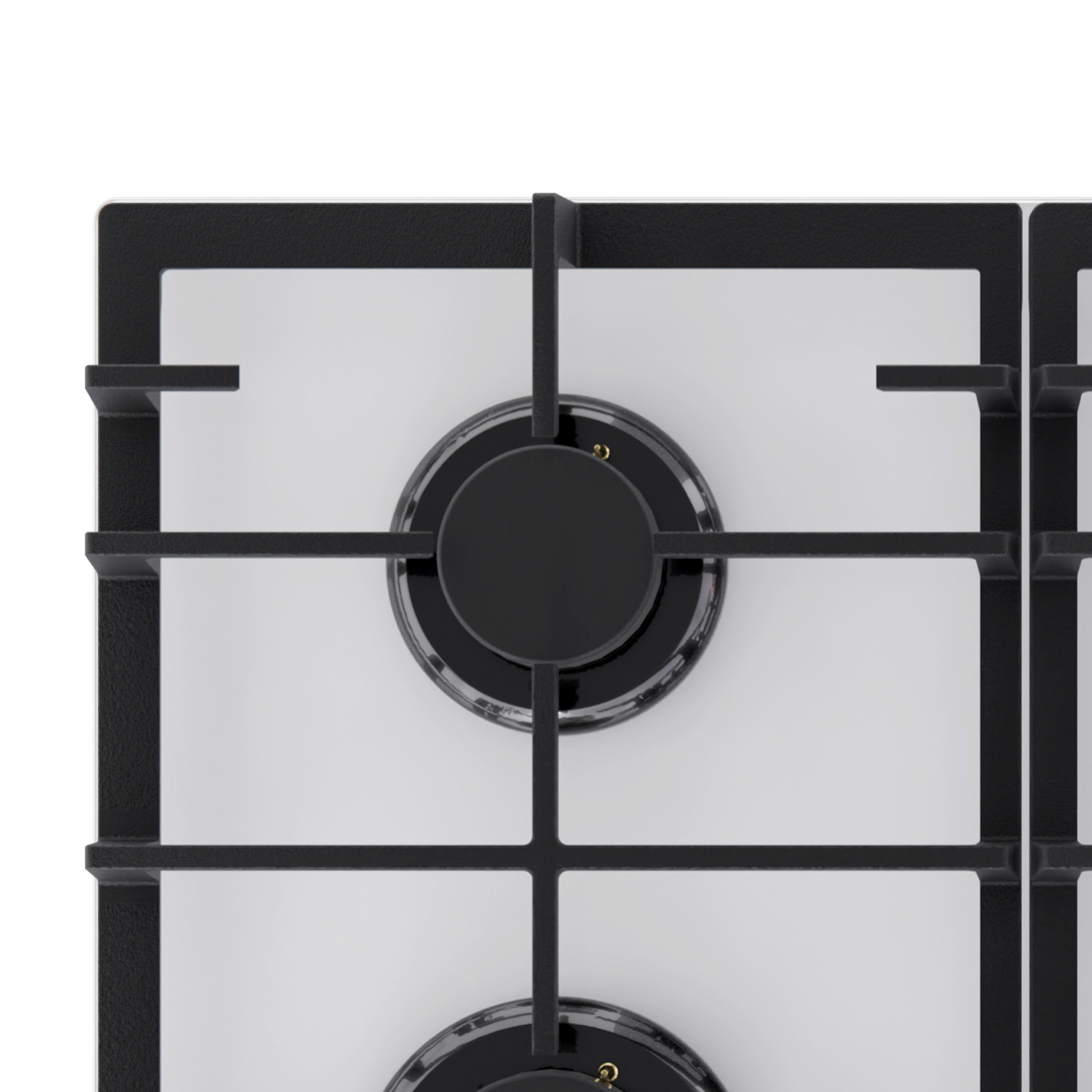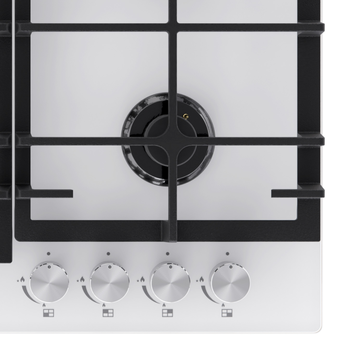 Описаниеповерхность газовая независимая, 60 см, газ на стекле, 4 конфорки, решетки чугунные, белый