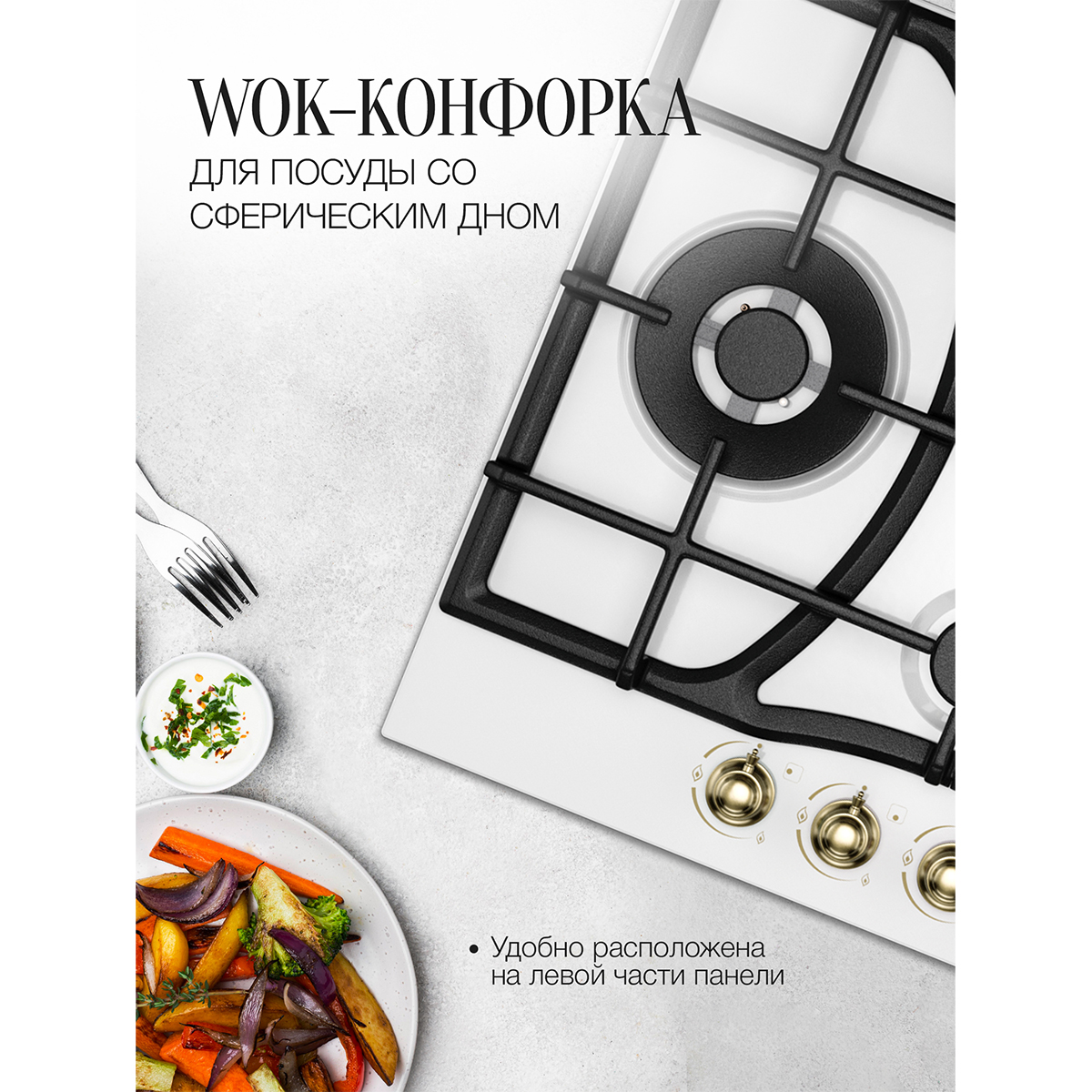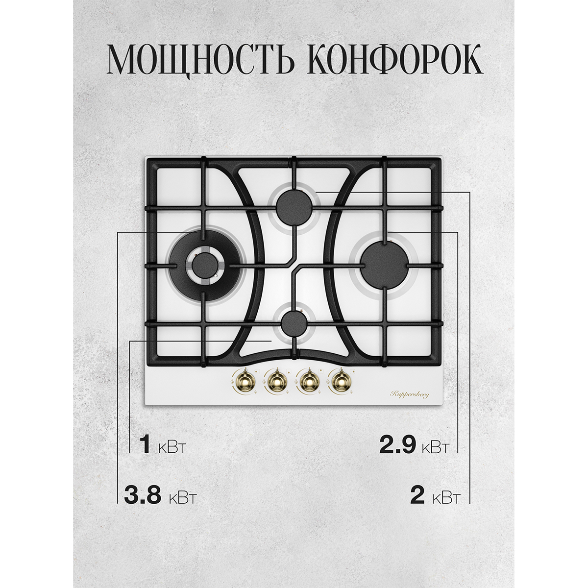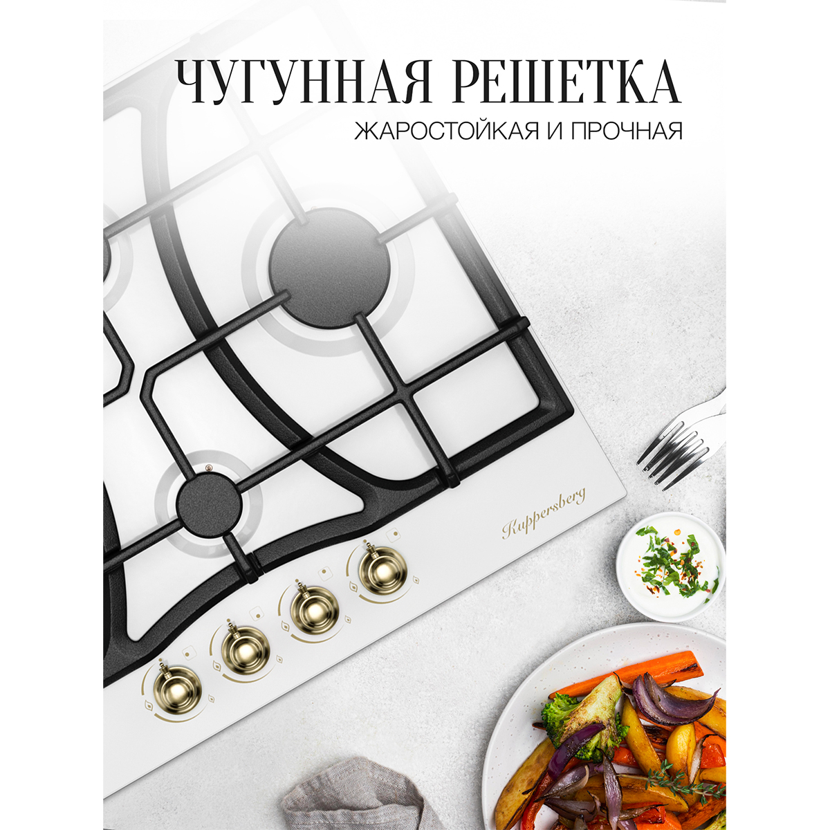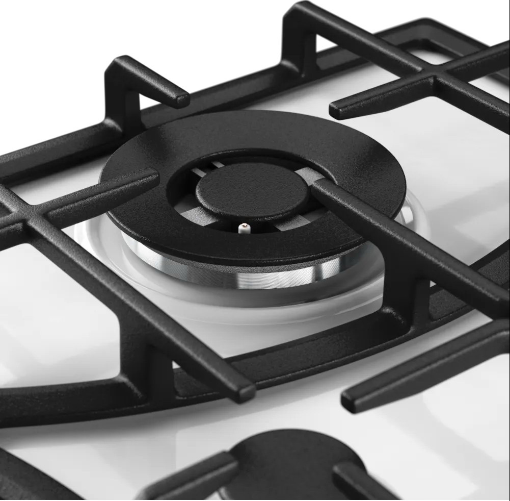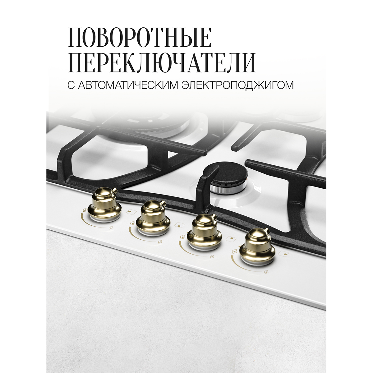Описаниеповерхность газовая независимая, 60 см, газ на эмали, 4 конфорки, решетки чугунные, белый / фурнитура бронзовая