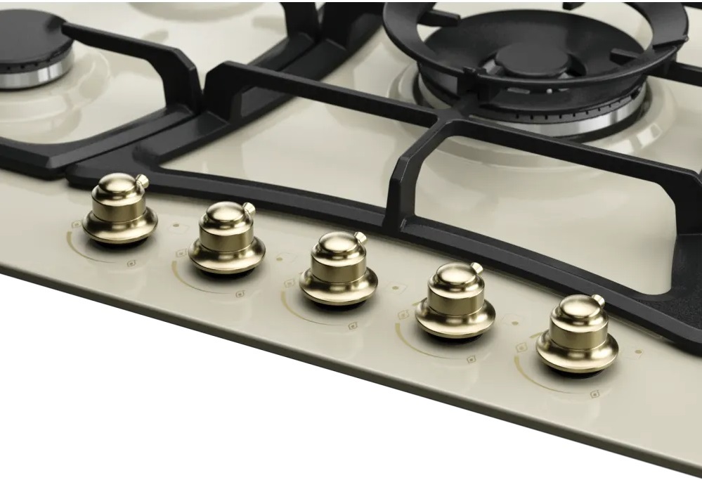 Описаниеповерхность газовая независимая, 90 см, газ на эмали, 5 конфорок, решетки чугунные, бежевый / фурнитура бронза