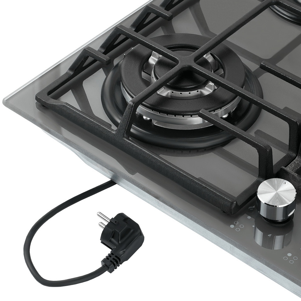 Описаниеповерхность газовая независимая, 60 см, газ на стекле, 4 конфорки, решетки чугунные, серый