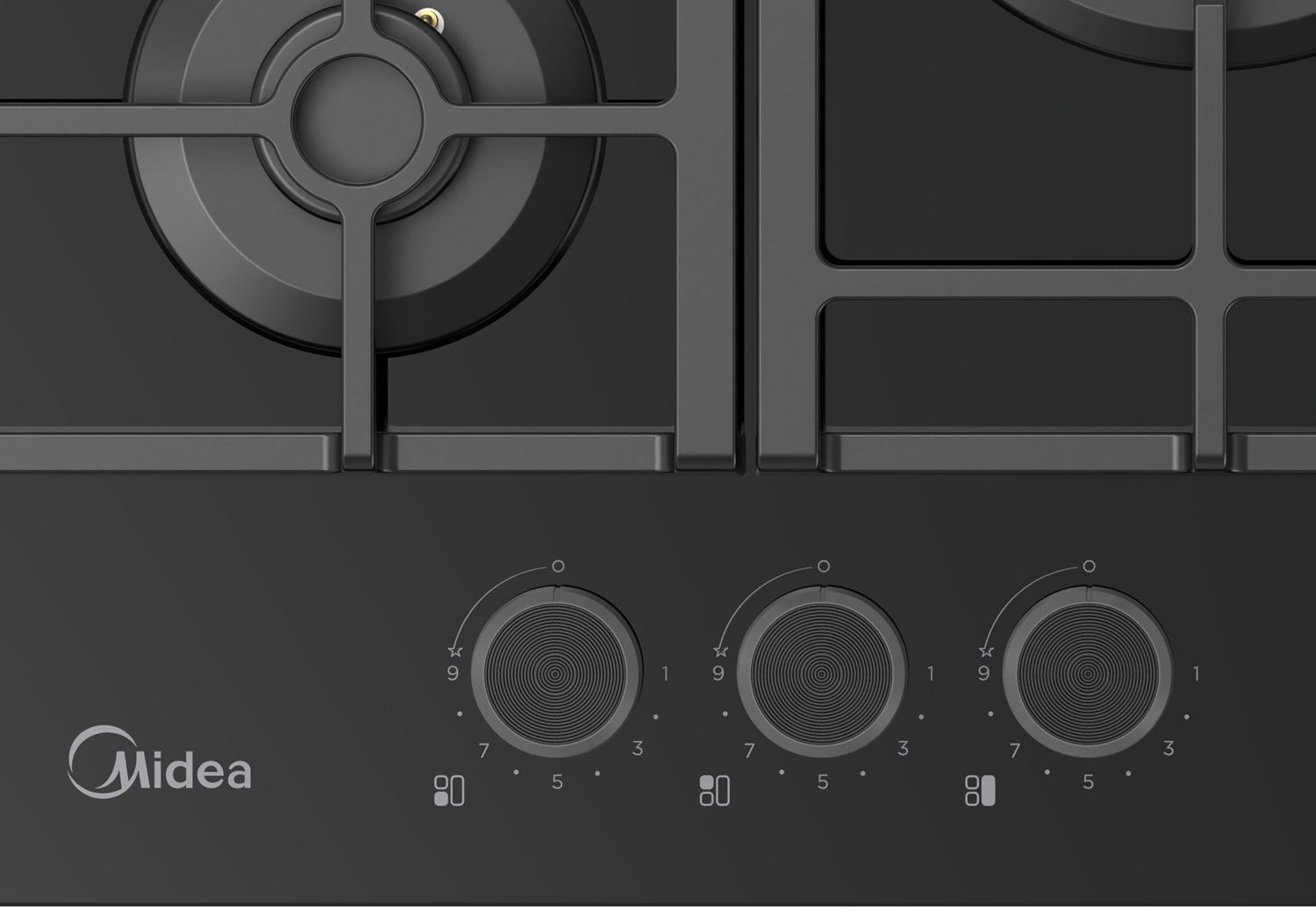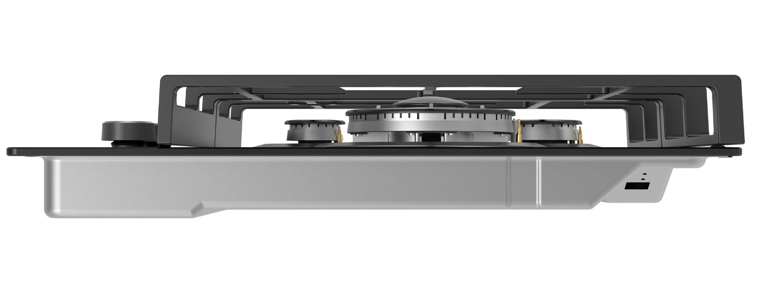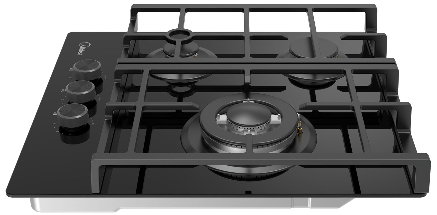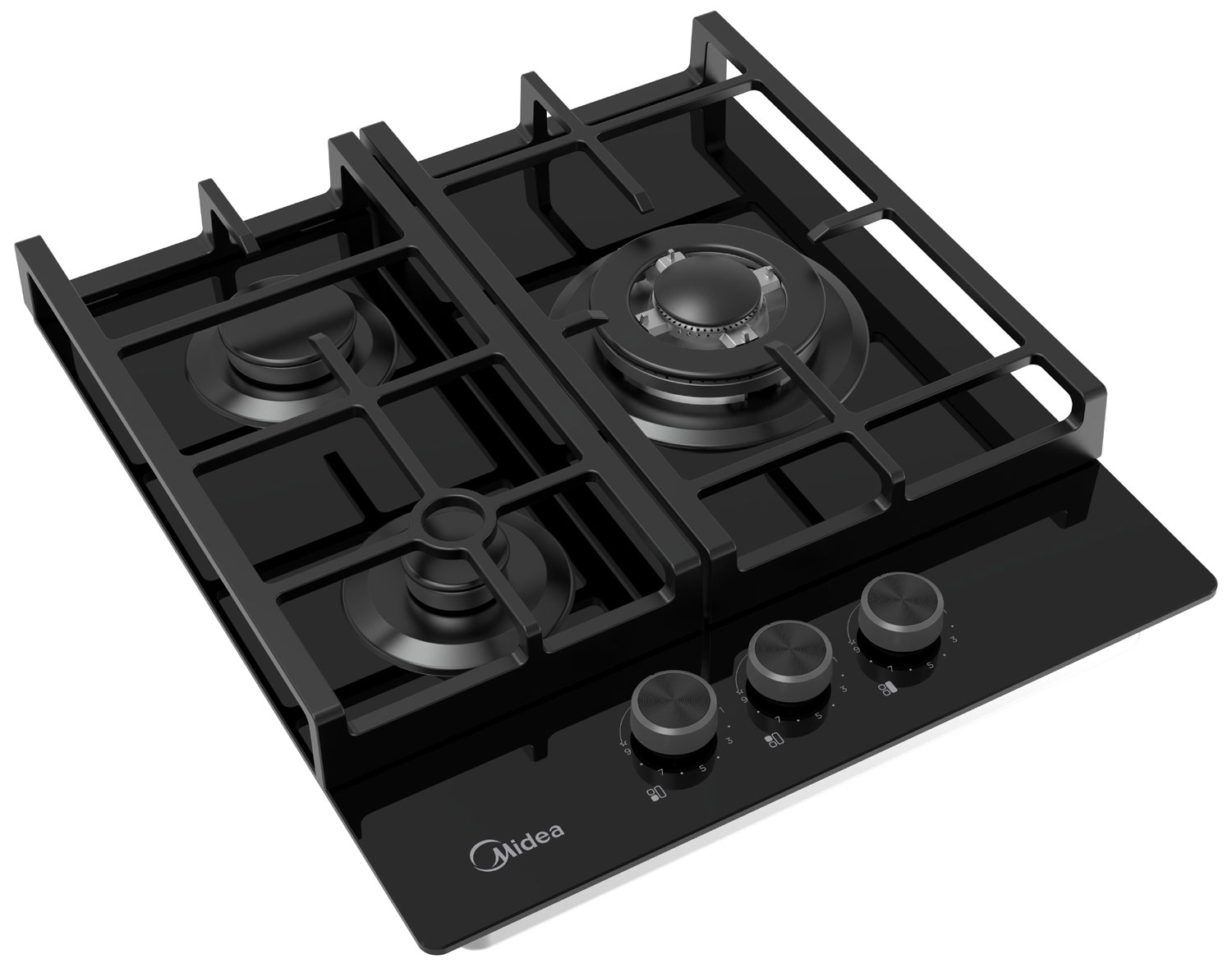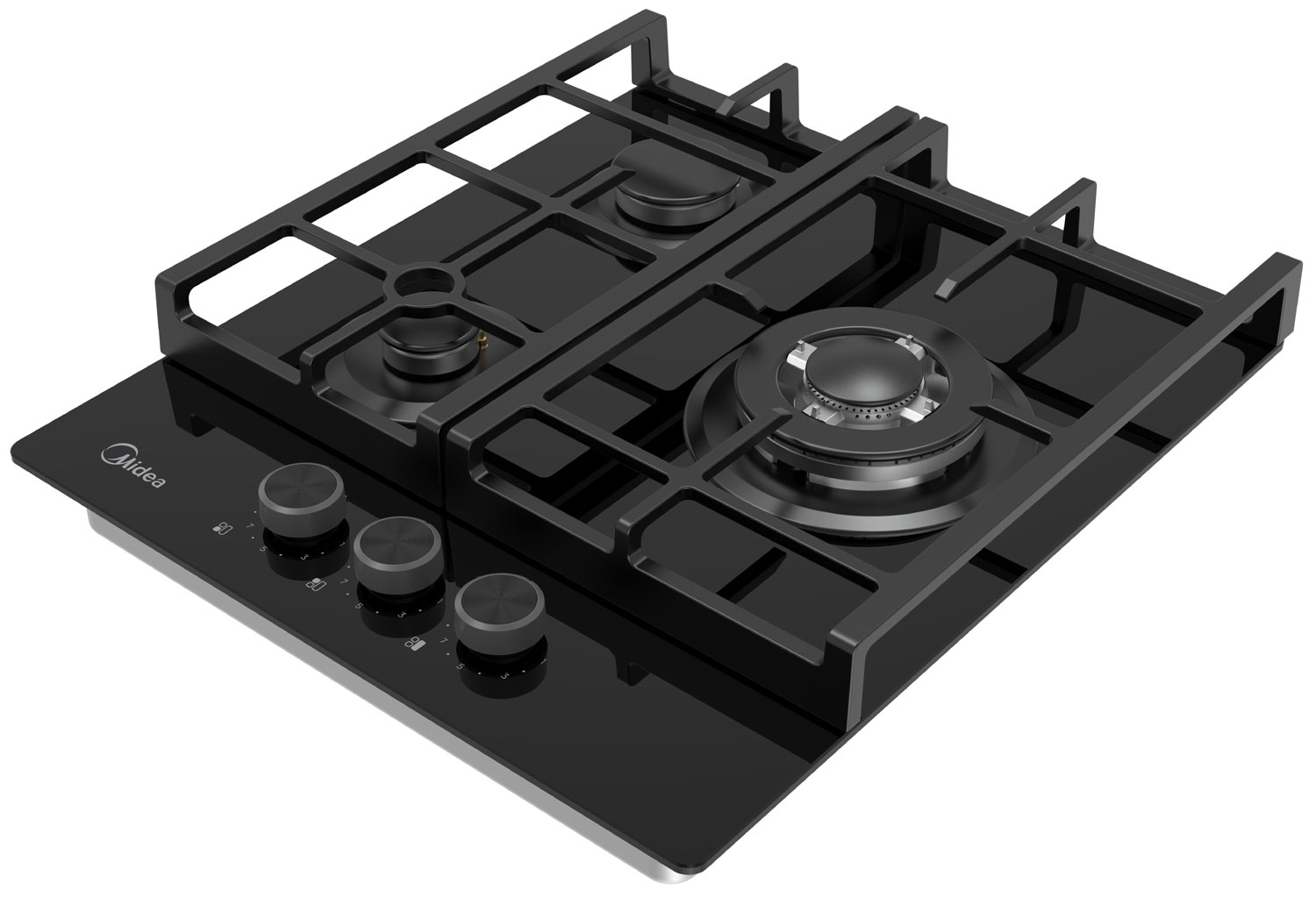 Описаниеповерхность газовая независимая, 45 см, газ на стекле, 3 конфорки, решетки чугунные, черный