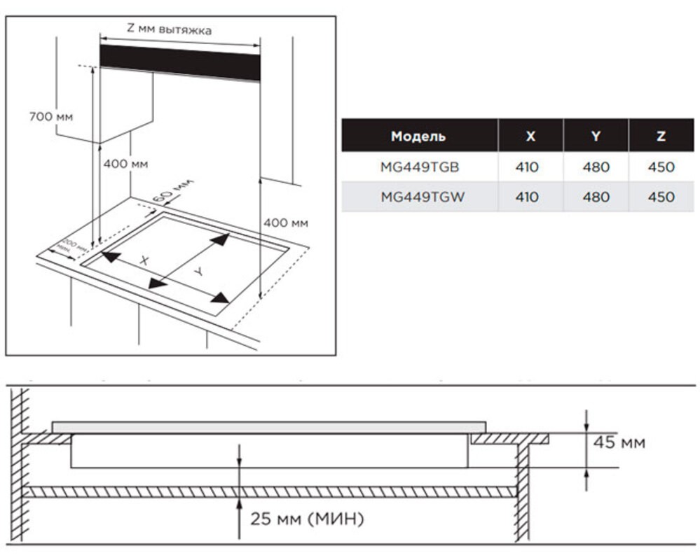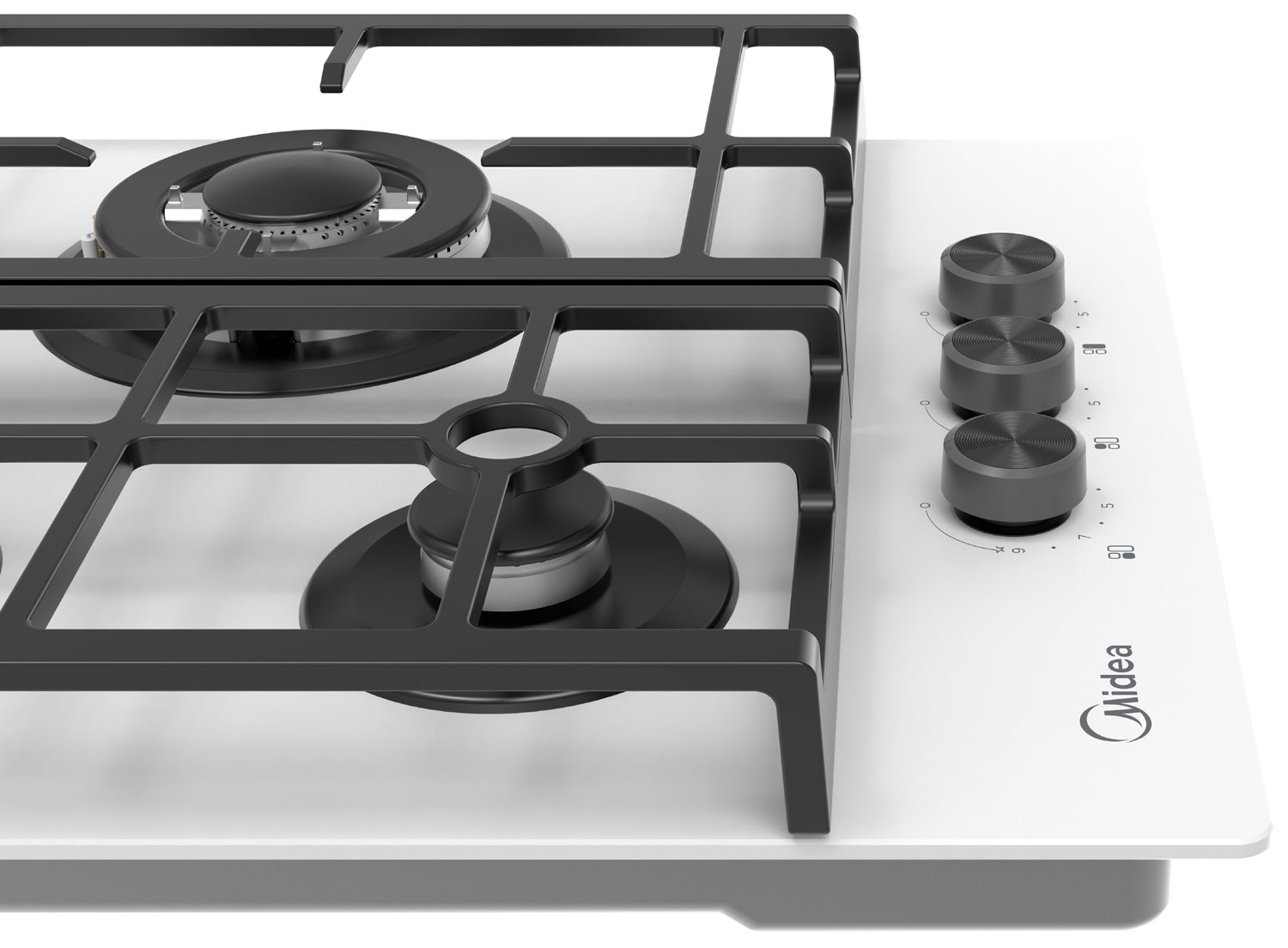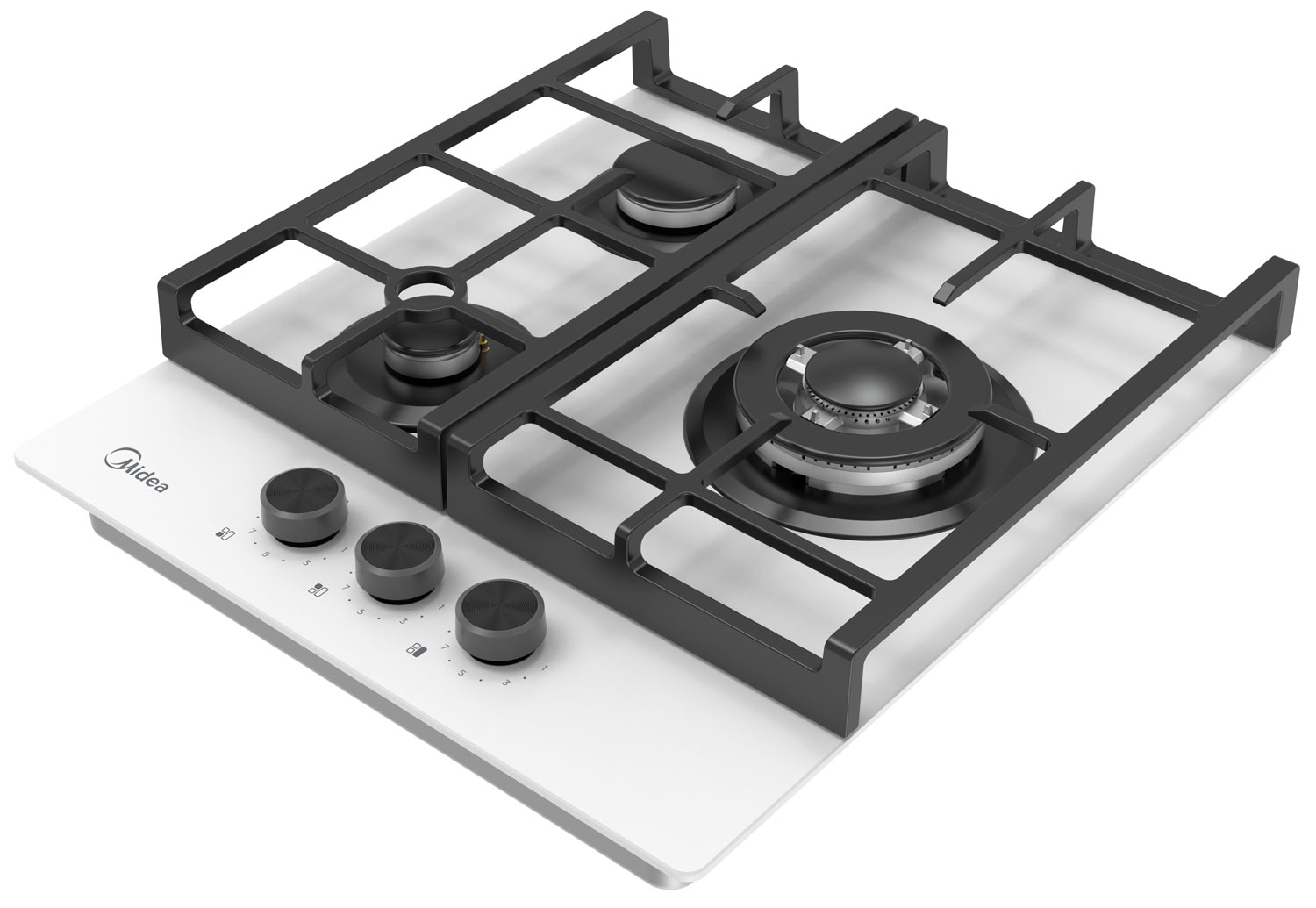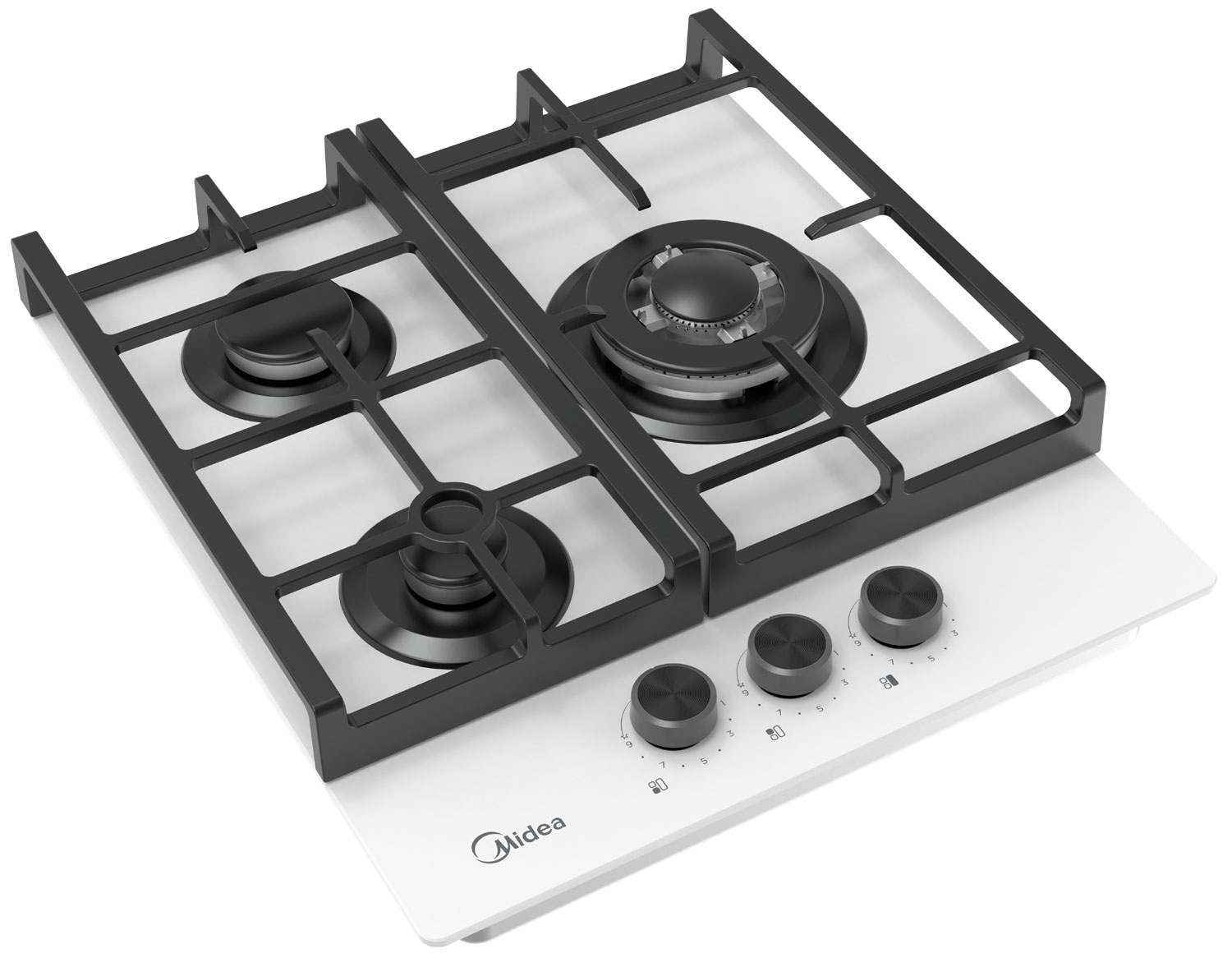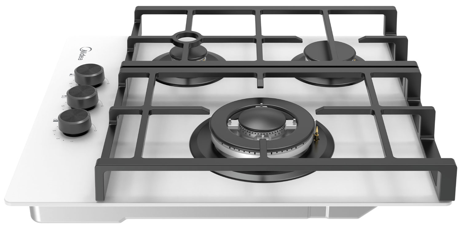 Описаниеповерхность газовая независимая, 45 см, газ на стекле, 3 конфорки, решетки чугунные, белый
