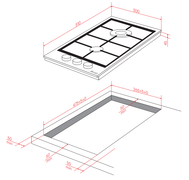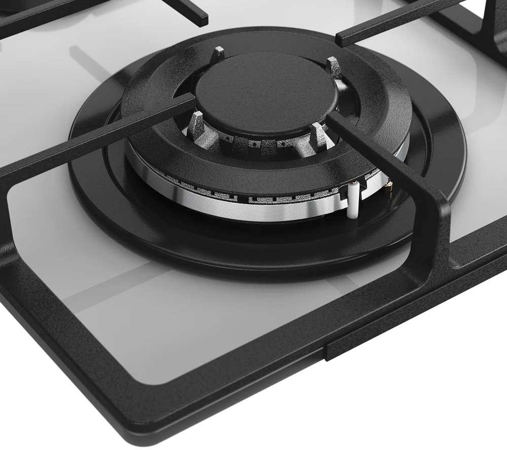Описаниеповерхность газовая независимая, 30 см, газ на стекле, 2 конфорки, решетки чугунные, белый