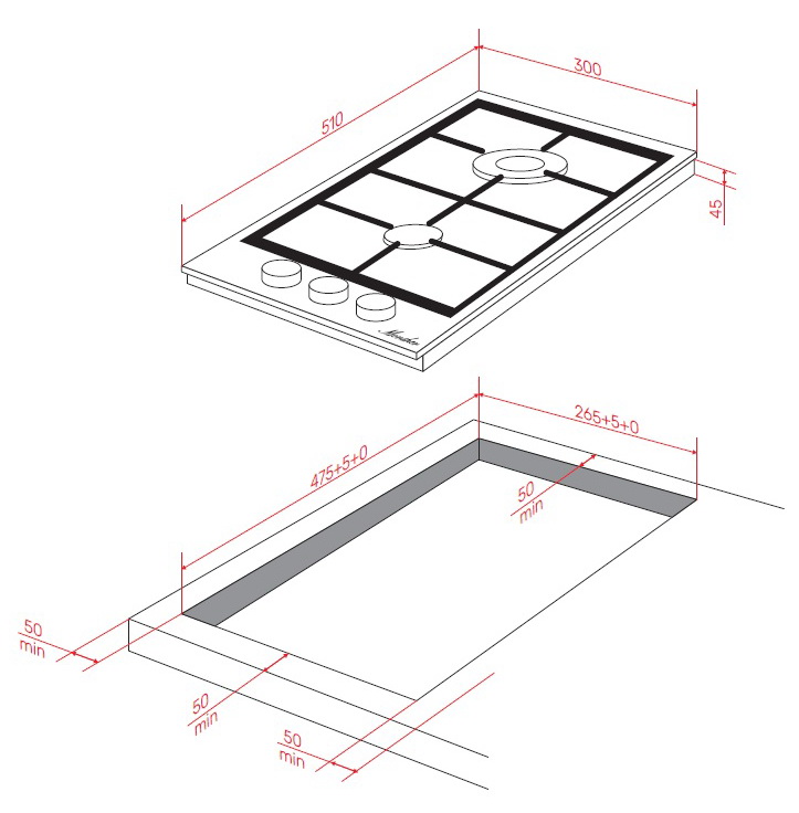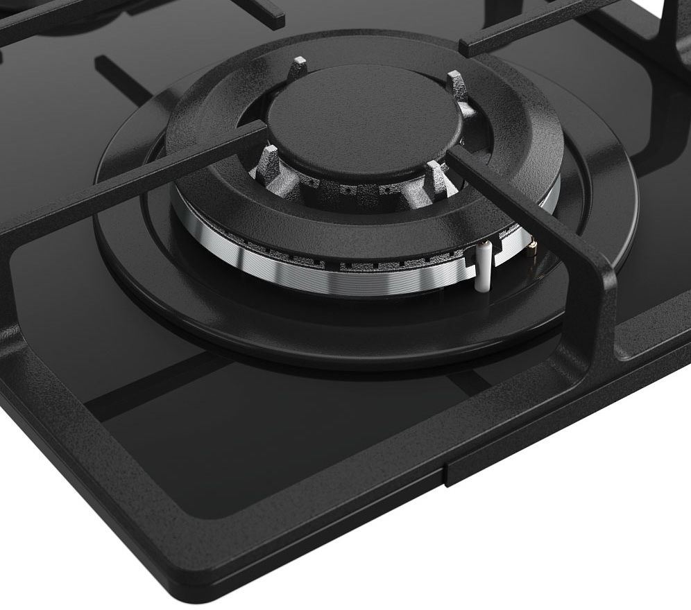 Описаниеповерхность газовая независимая, 30 см, газ на стекле, 2 конфорки, решетки чугунные, черный