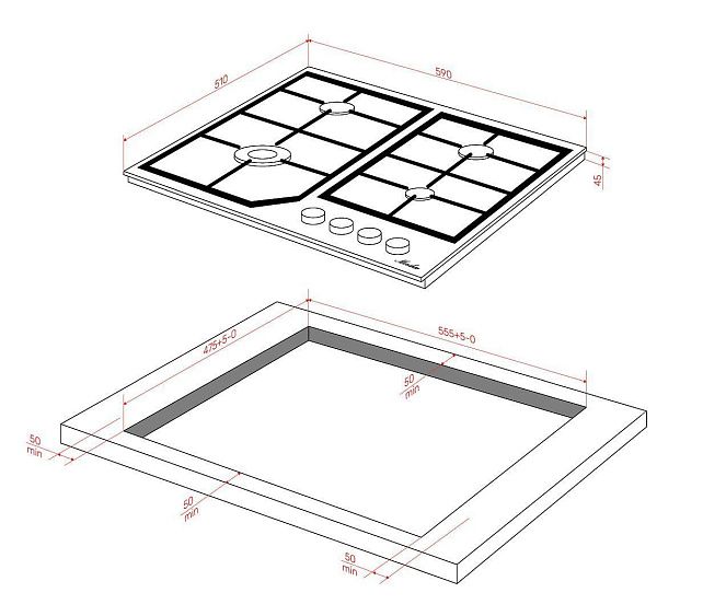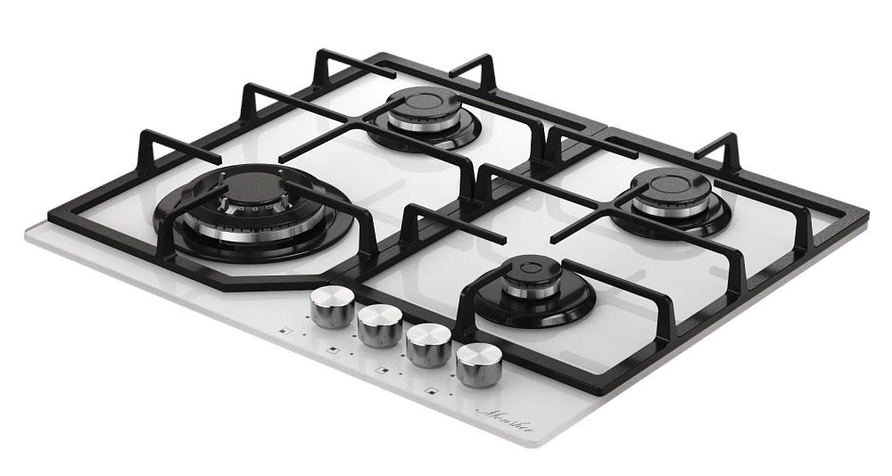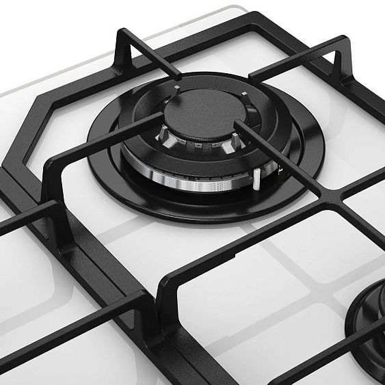 Описаниеповерхность газовая независимая, 60 см, газ на стекле, 4 конфорки, решетки чугунные, белый