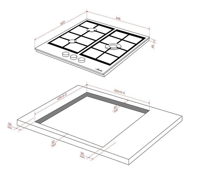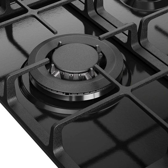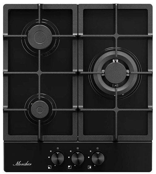 Описаниеповерхность газовая независимая, 45 см, газ на эмали, 3 конфорки, решетки чугунные, черный