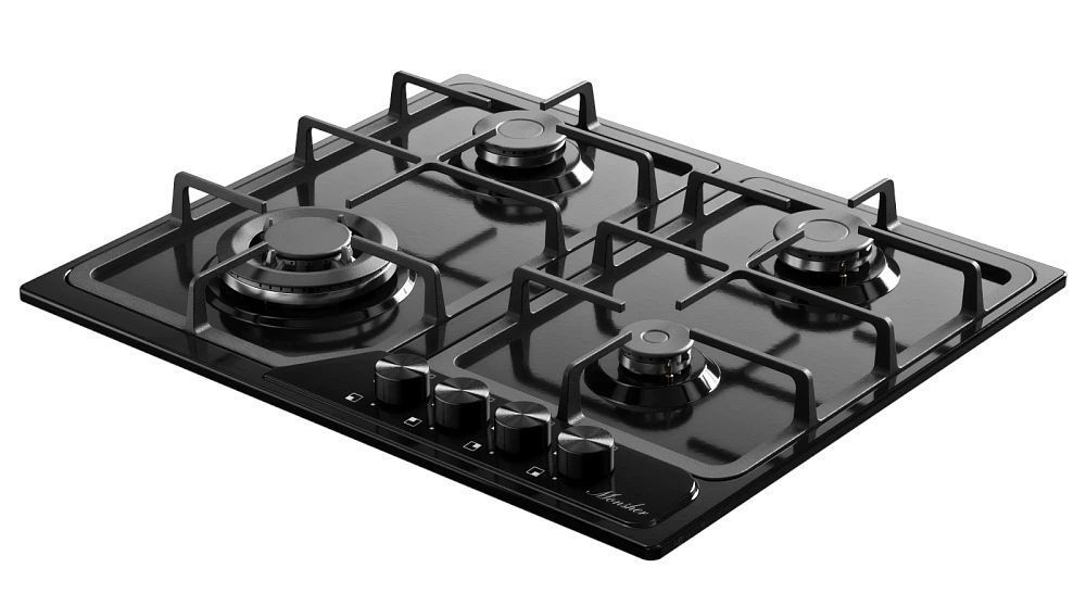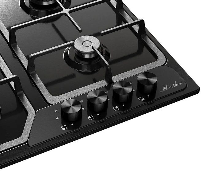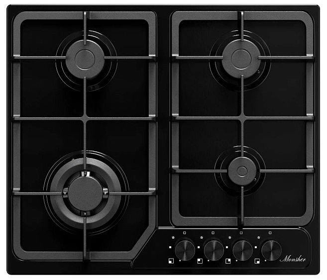 Описаниеповерхность газовая независимая, 60 см, газ на эмали, 4 конфорки, решетки чугунные, черный
