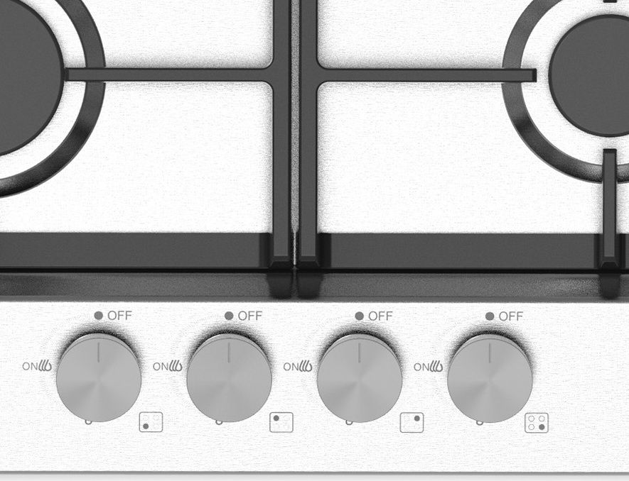Описаниеповерхность газовая независимая, 60 см, газ на металле, 4 конфорки, решетки чугунные, нержавеющая сталь