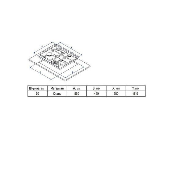 Описаниеповерхность газовая независимая, 60 см, газ на металле, 4 конфорки, решетки чугунные, нержавеющая сталь