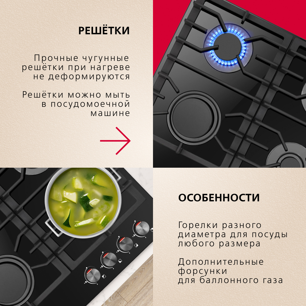 Описаниеповерхность газовая, 60 см, газ на стекле, 4 конфорки, решетки чугунные, черный