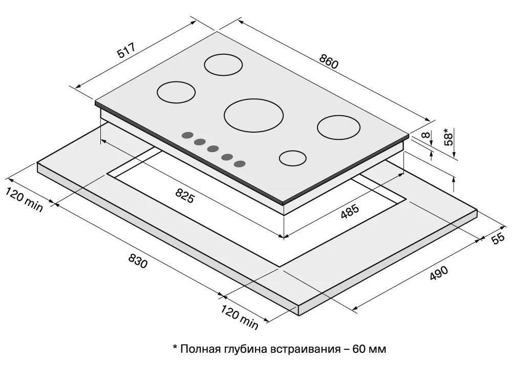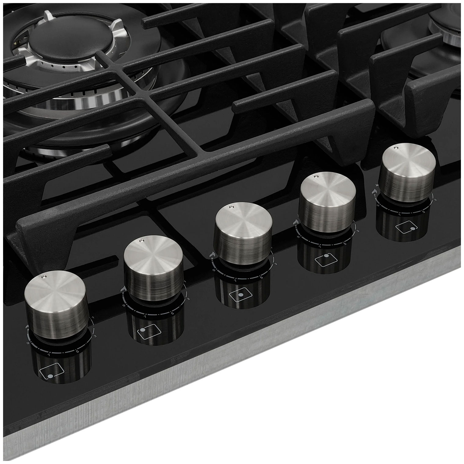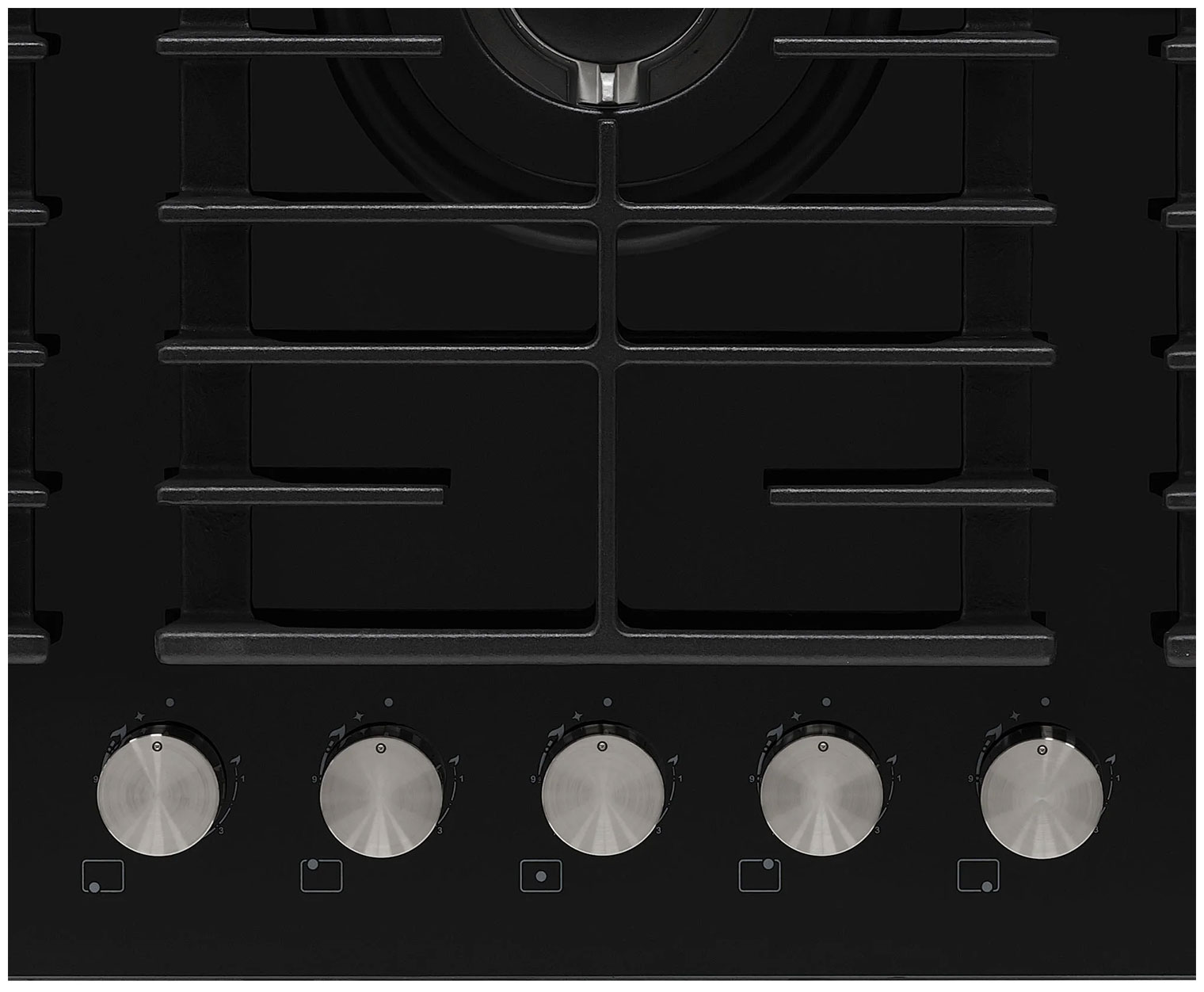 Описаниеповерхность газовая, 86 см, газ на стекле, 5 конфорок, решетки чугунные, черный