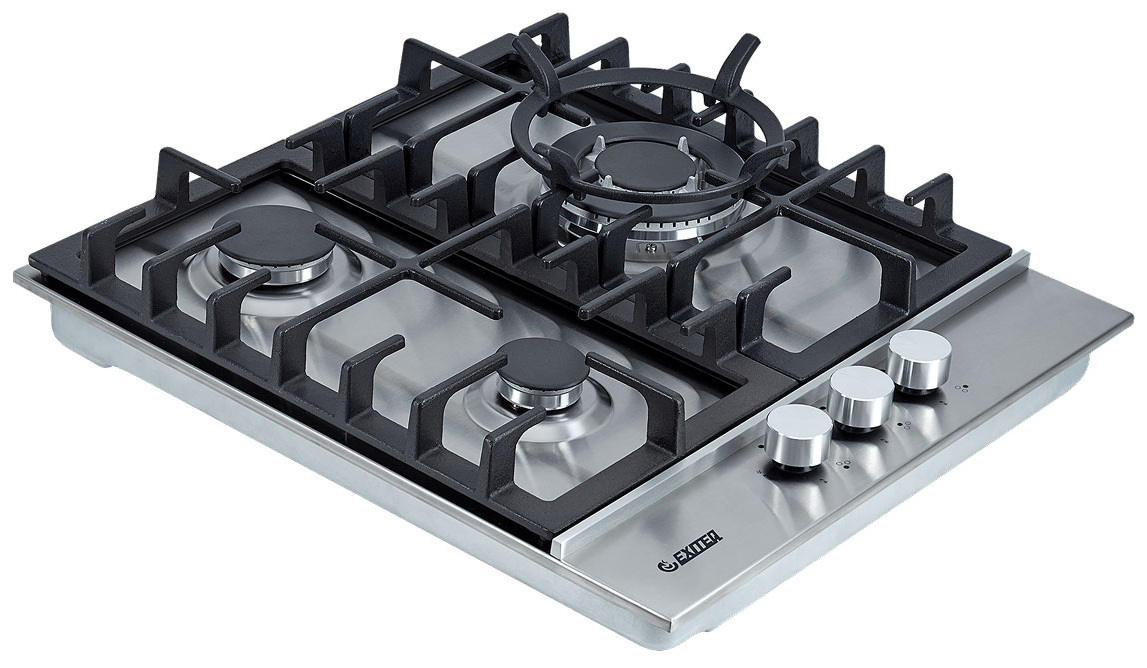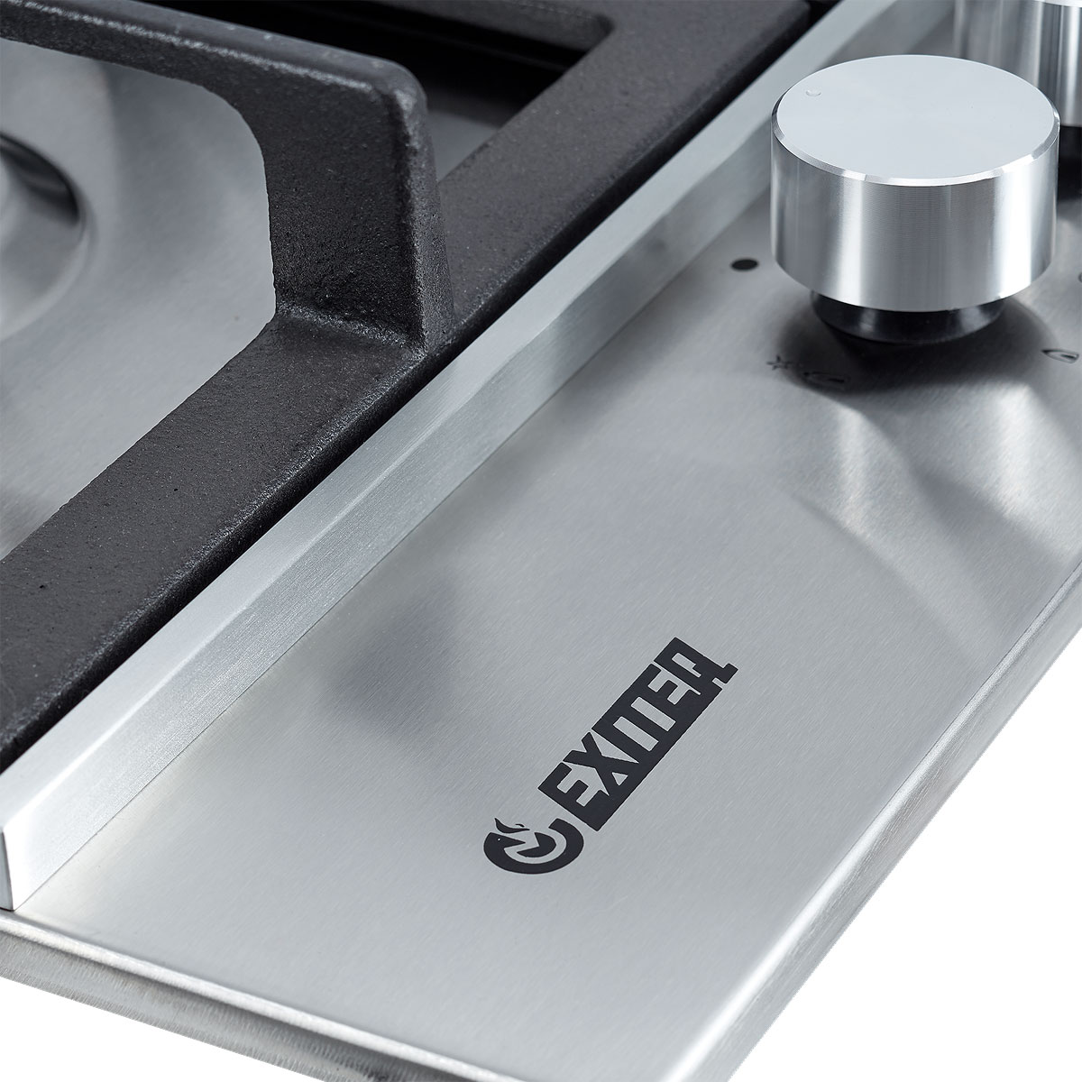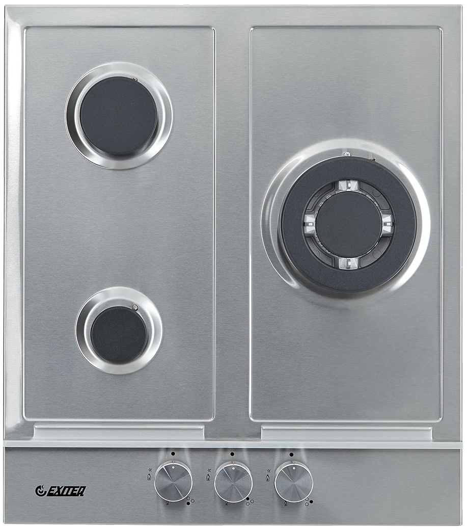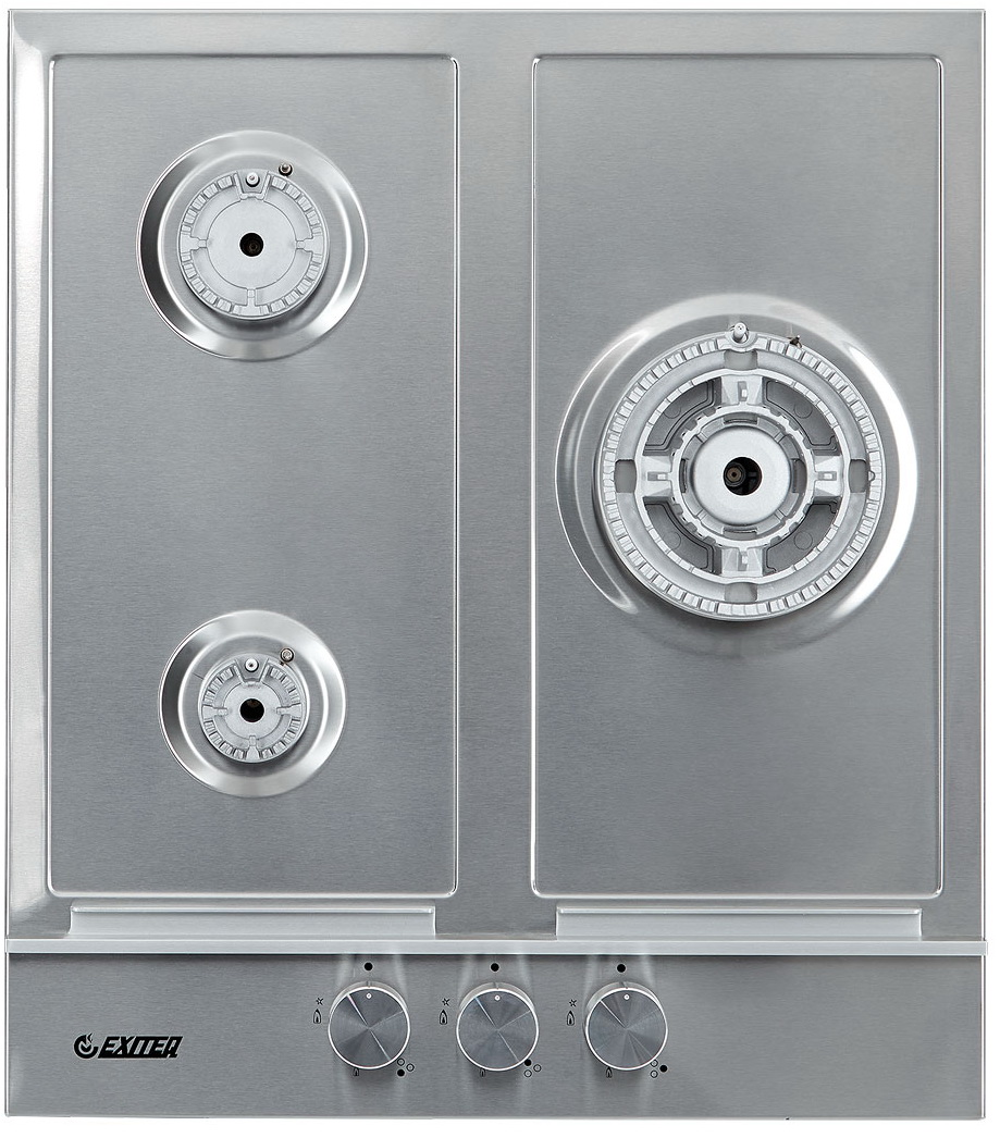 Описаниеповерхность газовая, 45 см, газ на металле, 3 конфорки, решетки чугунные, нержавеющая сталь
