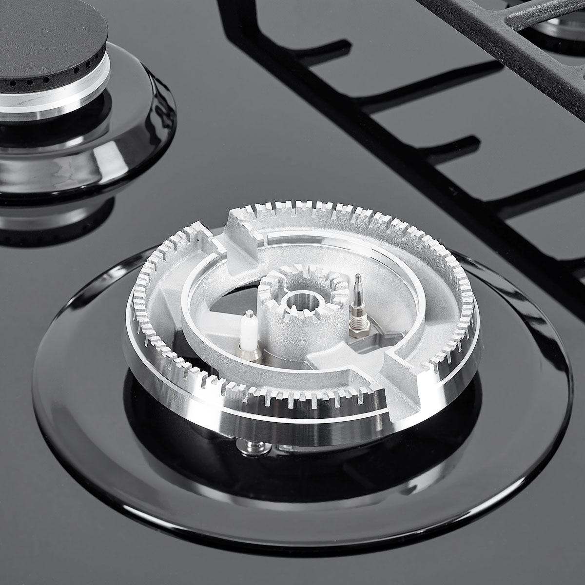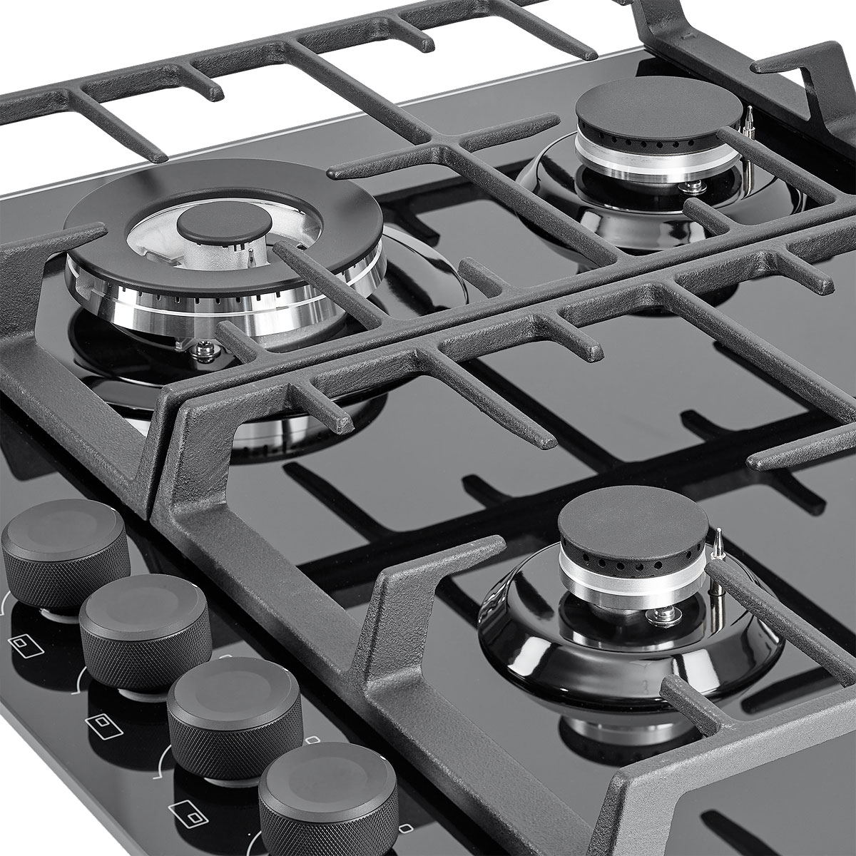 Описаниеповерхность газовая, 60 см, газ на стекле, 4 конфорки, решетки чугунные, черный