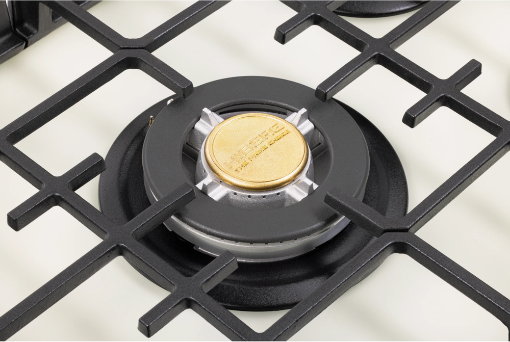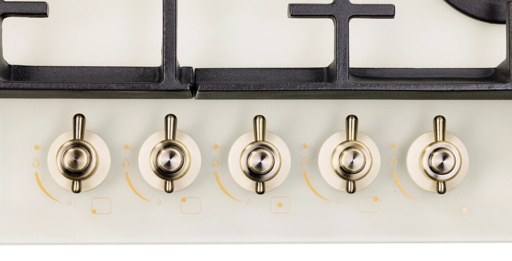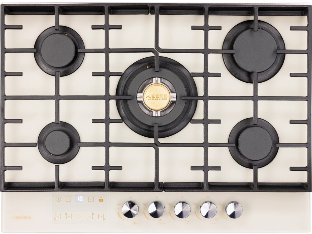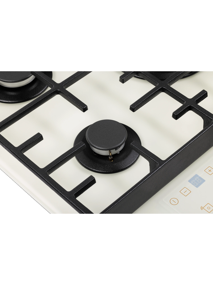 Описаниеповерхность газовая, 70 см, газ на стекле, 5 конфорок, решетки чугунные, бежевое матовое стекло