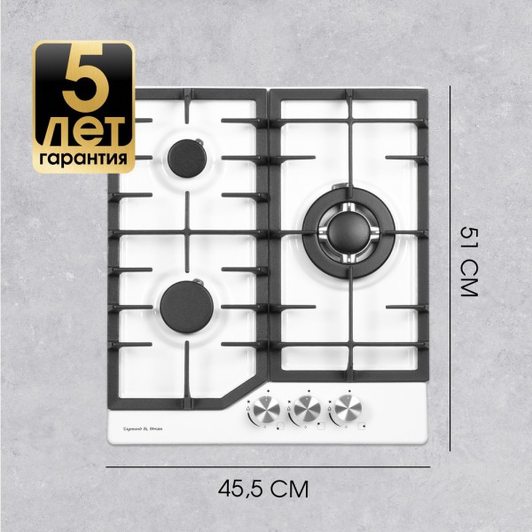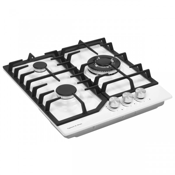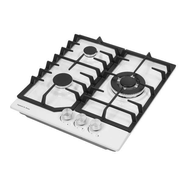 Описаниеповерхность газовая, 45 см, газ на эмали, 3 конфорки, решетки чугунные, белый