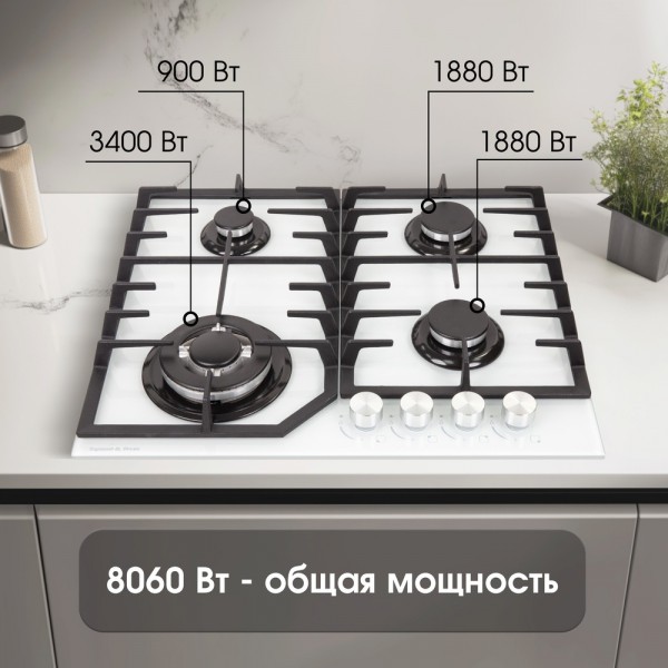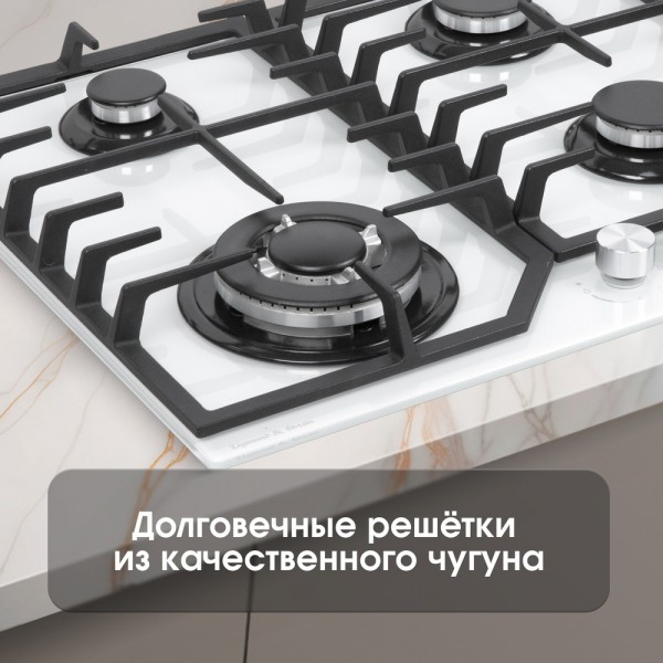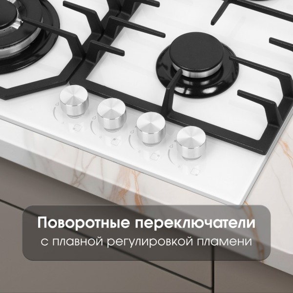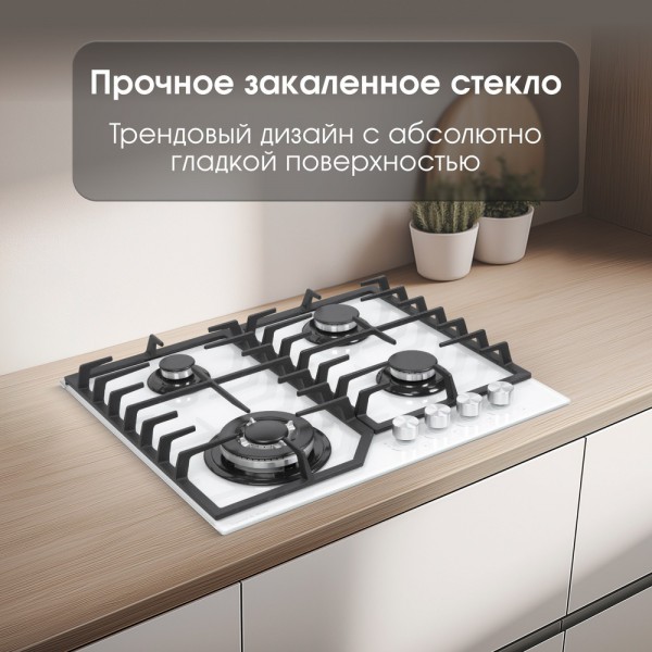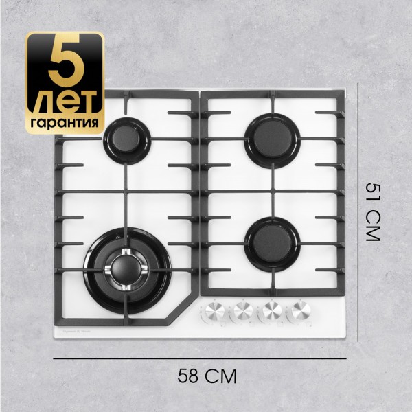 Описаниеповерхность газовая, 60 см, газ на стекле, 4 конфорки, решетки чугунные, белый