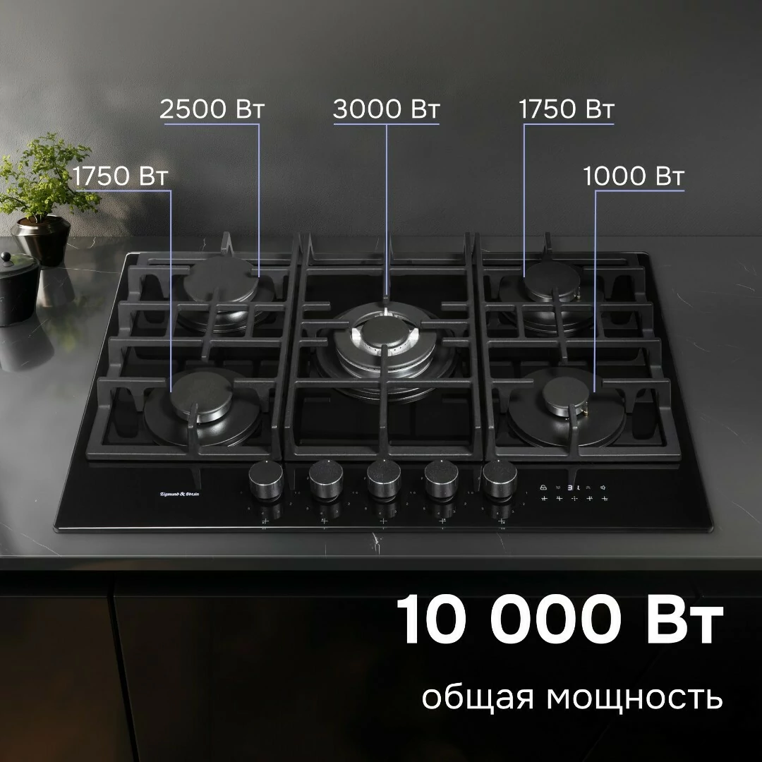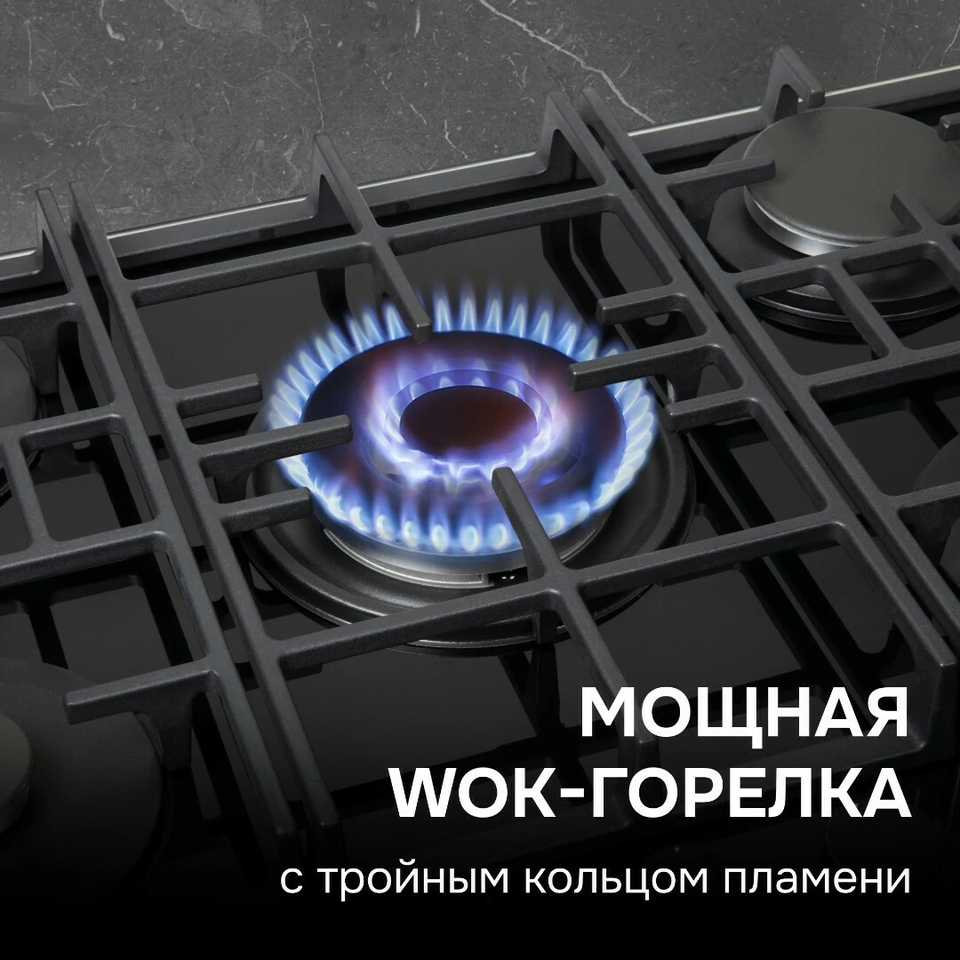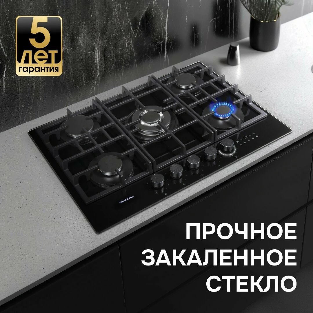 Описаниеповерхность газовая, 70 см, газ на стекле, 5 конфорки, решетки чугунные, черный