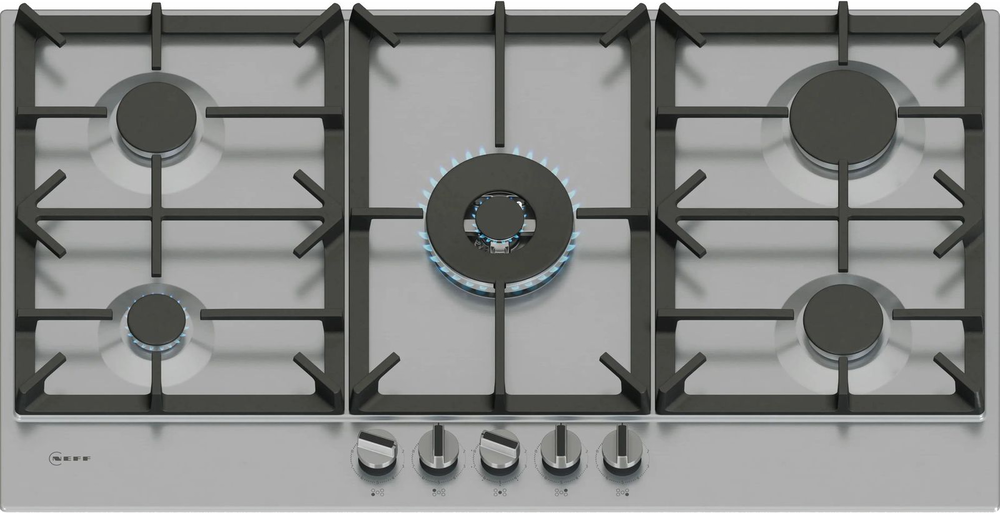 Описаниеповерхность газовая, 90 см, газ на металле, 5 конфорок, решетки чугунные, Flame Select, съемные ручки, решетки можно мыть в посудомоечной машине