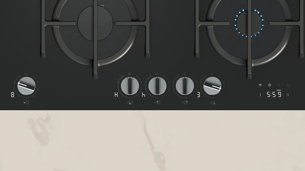 Описаниеповерхность газовая, 90 см, газ на стекле, 5 конфорок, решетки чугунные, черный, Flame Select, решетки можно мыть в посудомоечной машине, ручки с подсветкой и removibil, Home Connect, дисплей