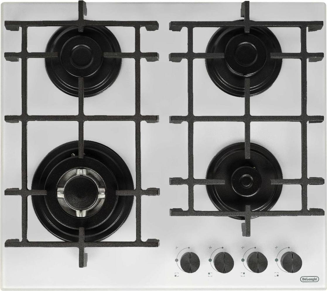 Описаниеповерхность газовая, 60 см, газ на стекле, 4 конфорки, решетки чугунные, белое стекло
