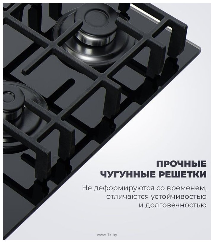 Описаниеповерхность газовая, 60 см, газ на стекле, 4 конфорки, решетки чугунные, черное стекло