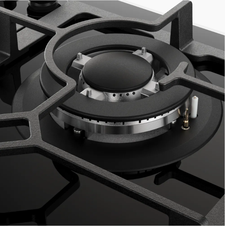 Описаниеповерхность газовая, 60 см, газ на стекле, 4 конфорки, решетки чугунные, черный