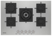 Описаниеповерхность газовая, 75 см, газ на металле, 5 конфорки, решетки чугунные, нержавеющая сталь