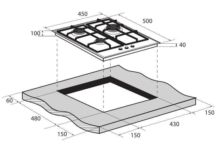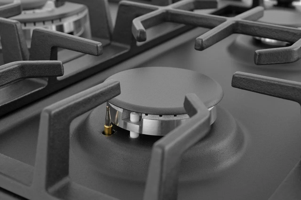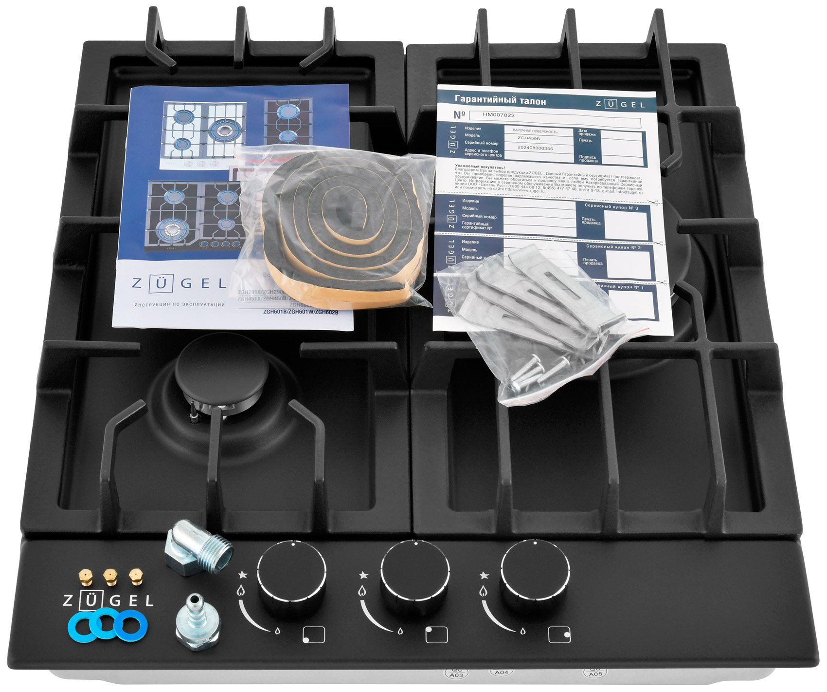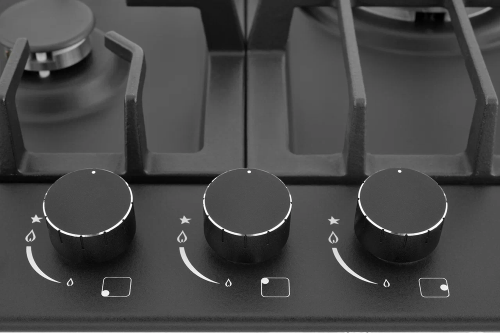 Описаниеповерхность газовая, 45 см, газ на эмали, 3 конфорки, решетки чугунные, черный