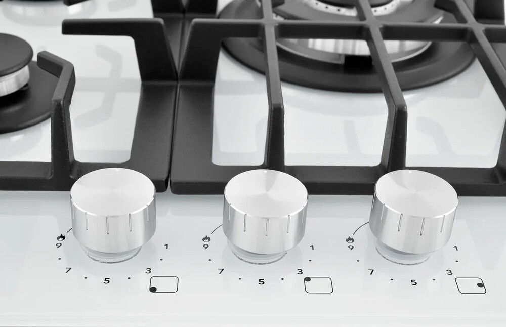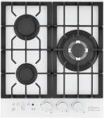 Описаниеповерхность газовая, 45 см, газ на стекле, 3 конфорки, решетки чугунные, белый