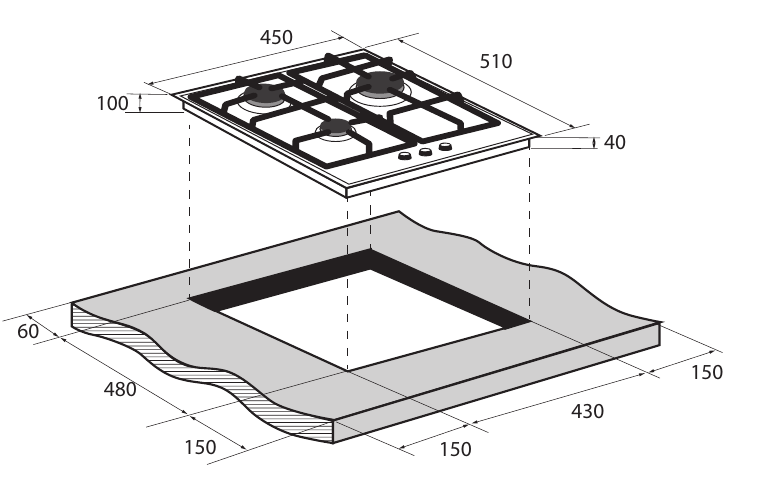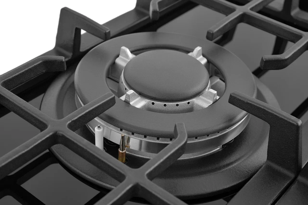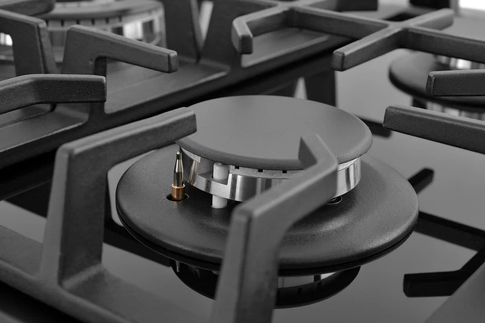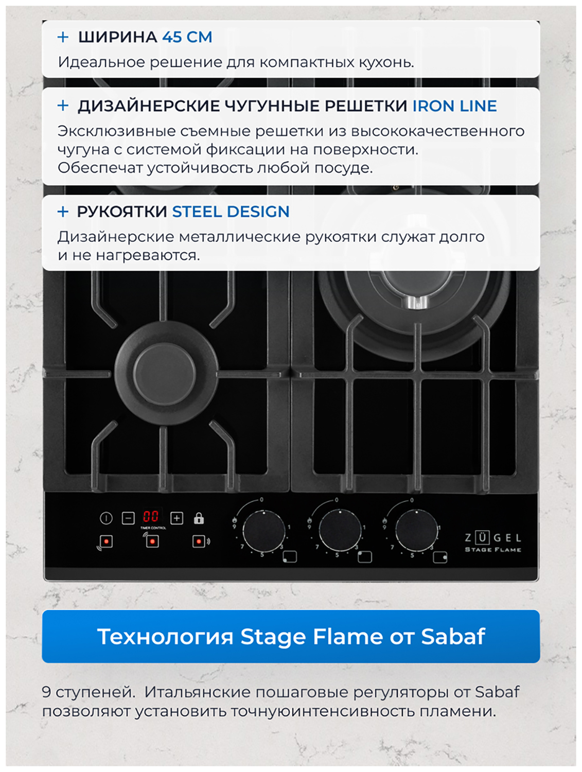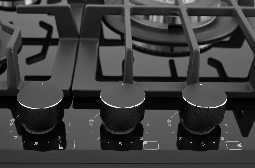 Описаниеповерхность газовая, 45 см, газ на стекле, 3 конфорки, решетки чугунные, черный