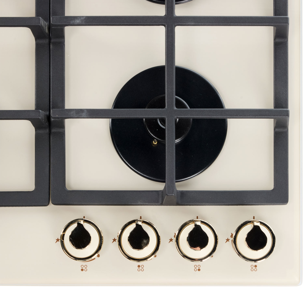 Описаниеповерхность газовая, 60 см, газ на стекле, 4 конфорки, решетки чугунные, бежевый
