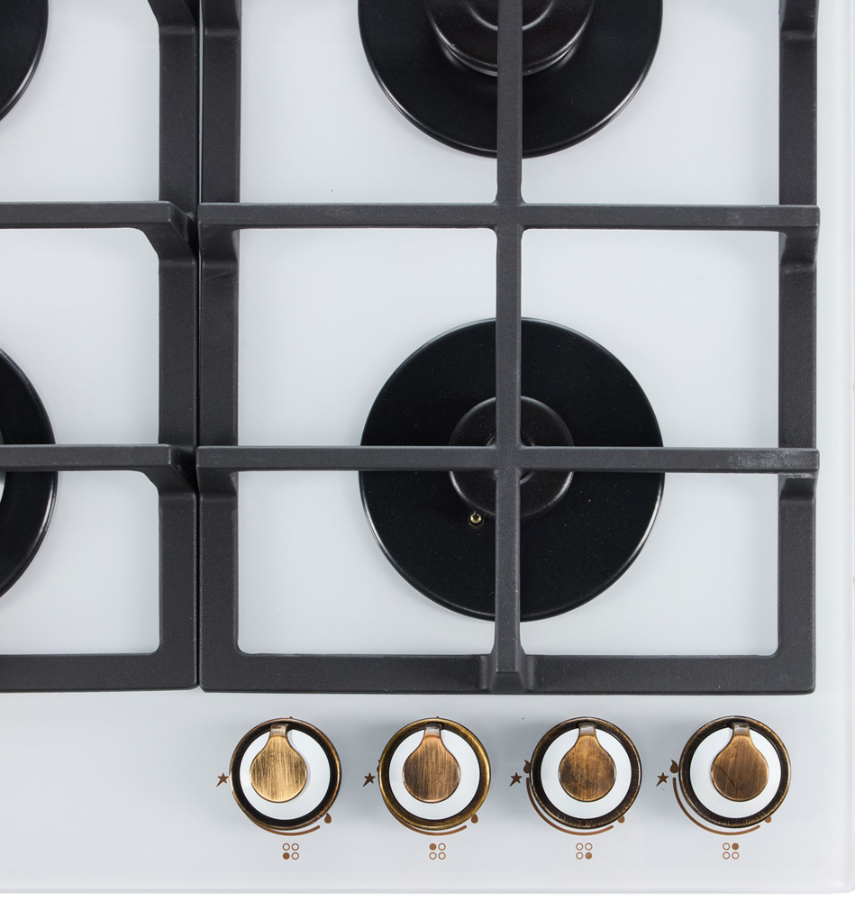 Описаниеповерхность газовая, 60 см, газ на стекле, 4 конфорки, решетки чугунные, белый