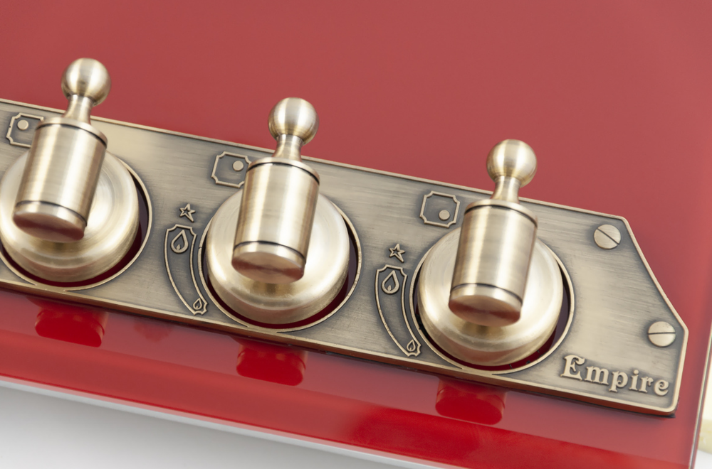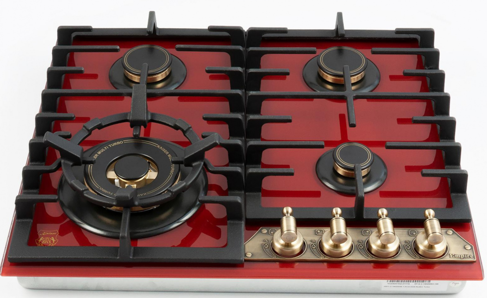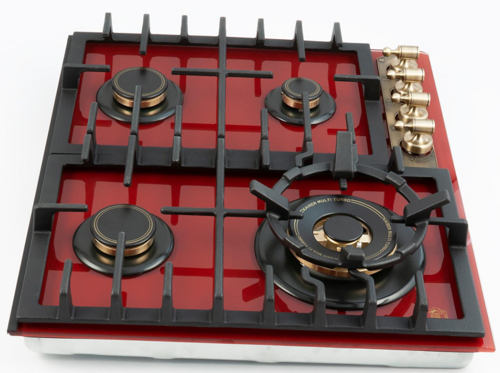 Описаниеповерхность газовая, 60 см, газ на стекле, 4 конфорки, чугунные решетки, красный