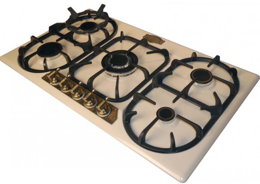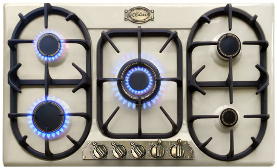 Описаниеповерхность газовая, 86 см, газ на эмали, 5 конфорок, чугунные решетки, слоновая кость