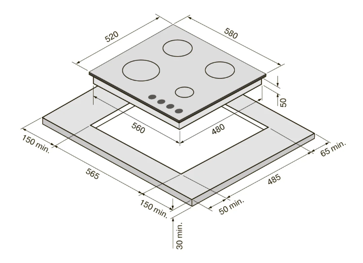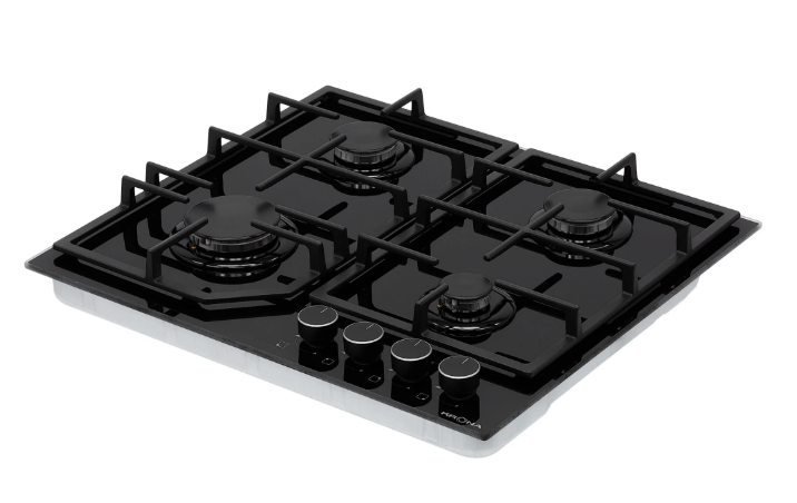 Описаниеповерхность газовая, 60 см, газ на стекле, 4 конфорки, решетки чугунные, черный