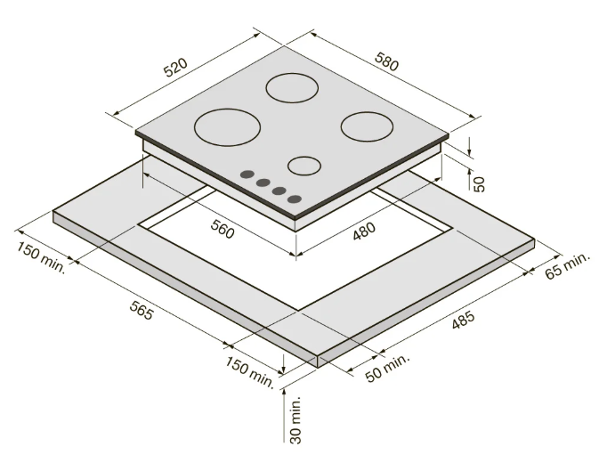 Описаниеповерхность газовая, 60 см, газ на стекле, 4 конфорки, решетки чугунные, черный