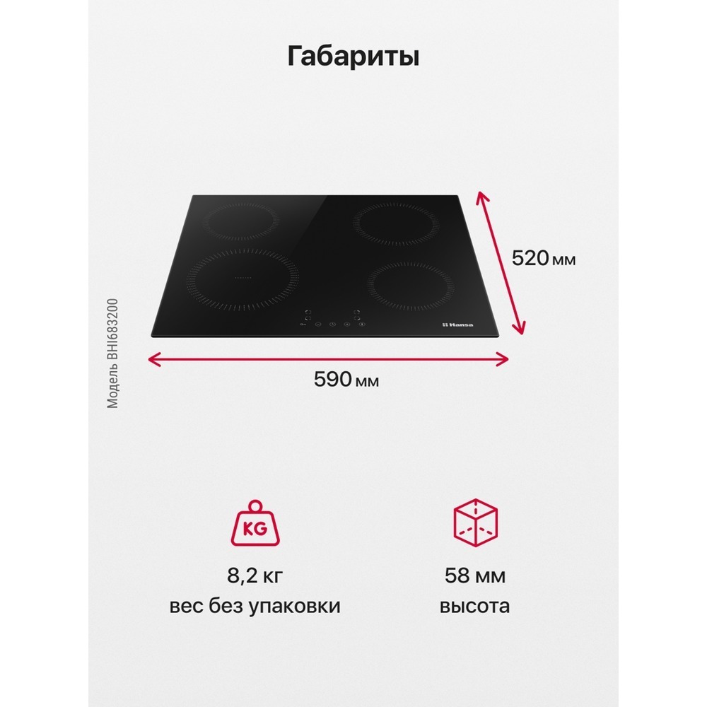 Размер (Высота) 5,8 см Размер (Глубина) 52 см Размер (Ширина) 59 см Цвет черный Ширина прибора 60 см Переключатели сенсорные Управление сенсорное Таймер есть Защита от детей есть Мощность подключения, Вт 6800 Фурнитура нет Гарантийный срок (месяцы) 12 Страна производитель Китай Ссылка на сайт производителя https://hansa.ru/product/indukcionnaya-varochnaya-poverhnost-hansa-bhi683200-chernyy Всего конфорок 4 Рабочая поверхность стеклокерамика Количество индукционных конфорок 4 Тип поверхности индукционная Встроенная вытяжка нет Расположение панели управления спереди Зона расширения нет Функция Booster есть Дизайн рамки без рамки Размер в упаковке (Высота) 10,5 см Размер в упаковке (Ширина) 64,5 см Размер в упаковке (Глубина) 57 см Вес прибора 10 кг Размер (Ширина), см 59 Размер (Высота), см (Общие) 5,8 Размер (Глубина), см 52 - Отзывы