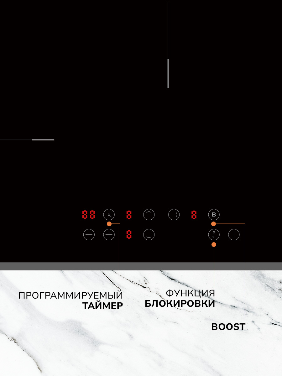Описаниеповерхность варочная стеклокерамическая независимая индукционная, 45 см, черный, скошенные края