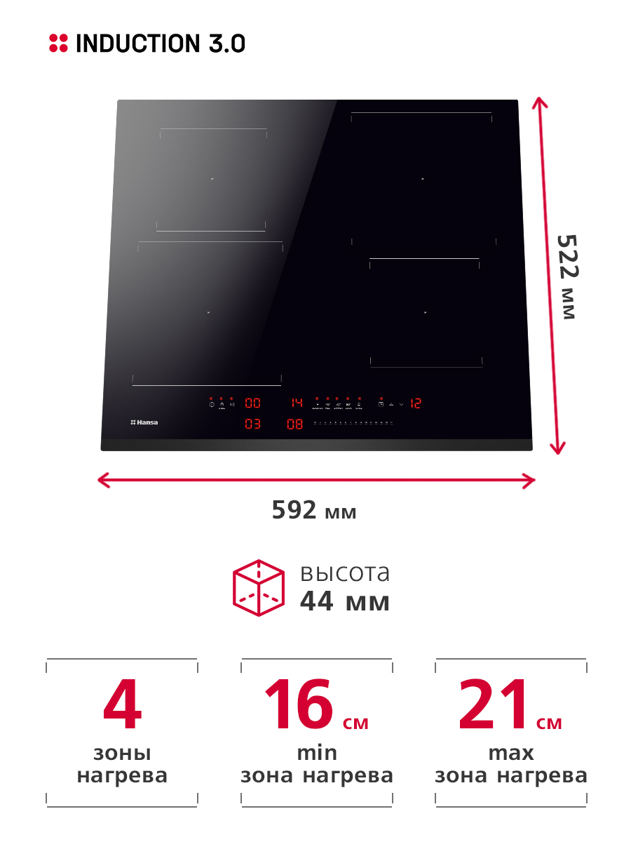 Размер (Высота) 4,9 см Размер (Глубина) 52,2 см Размер (Ширина) 59,2 см Цвет черный Ширина прибора 60 см Переключатели сенсорные Управление сенсорное Таймер есть Защита от детей нет Мощность подключения, Вт 7350 Фурнитура нет Гарантийный срок (месяцы) 12 Страна производитель Польша Ссылка на сайт производителя https://www.hansa.ru/catalog/varochnye_poverkhnosti/bhi67116/?ysclid=lldpsupyce271628514 Всего конфорок 4 Рабочая поверхность стеклокерамика Количество индукционных конфорок 4 Тип поверхности индукционная Встроенная вытяжка нет Расположение панели управления спереди Зона расширения нет Функция Booster есть Дизайн рамки без рамки Размер в упаковке (Высота) 12,5 см Размер в упаковке (Ширина) 70 см Размер в упаковке (Глубина) 61,5 см Вес прибора 7,65 кг Размер (Ширина), см 59,2 Размер (Высота), см (Общие) 4,9 Размер (Глубина), см 52,2 - Отзывы