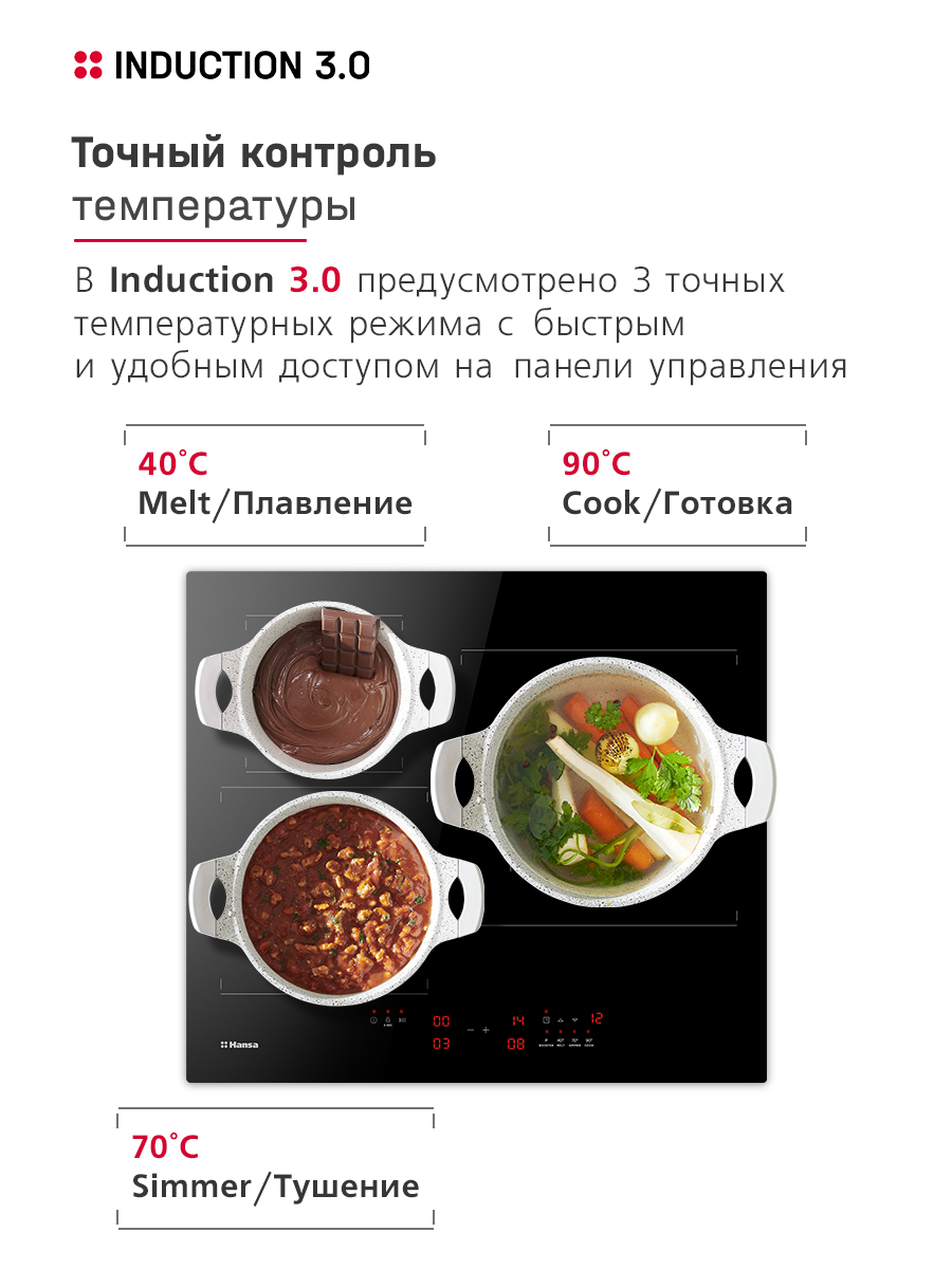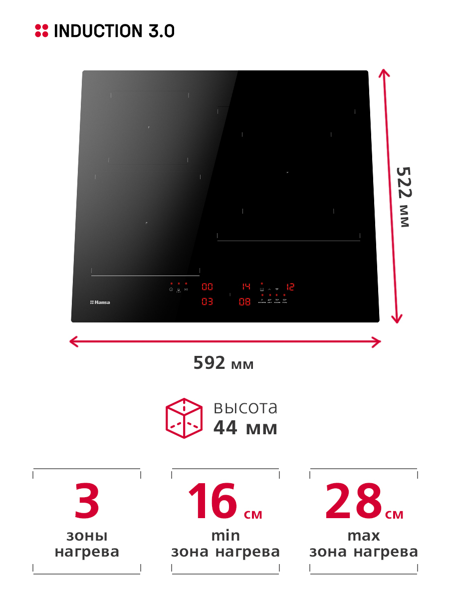 Размер (Высота) 4,4 см Размер (Глубина) 52,2 см Размер (Ширина) 59,2 см Цвет черный Ширина прибора 60 см Переключатели сенсорные Управление сенсорное Таймер есть Защита от детей есть Мощность подключения, Вт 7350 Фурнитура нет Гарантийный срок (месяцы) 12 Страна производитель Польша Ссылка на сайт производителя https://hansa.ru/product/indukcionnaya-varochnaya-poverhnost-hansa-bhi67006-chernyy Всего конфорок 3 Рабочая поверхность стеклокерамика Количество индукционных конфорок 3 Тип поверхности индукционная Встроенная вытяжка нет Расположение панели управления спереди Зона расширения нет Функция Booster есть Дизайн рамки без рамки Размер в упаковке (Высота) 7,4 см Размер в упаковке (Ширина) 62,2 см Размер в упаковке (Глубина) 55,2 см Вес прибора 7,65 кг Размер (Ширина), см 59,2 Размер (Высота), см (Общие) 4,4 Размер (Глубина), см 52,2 - Отзывы
