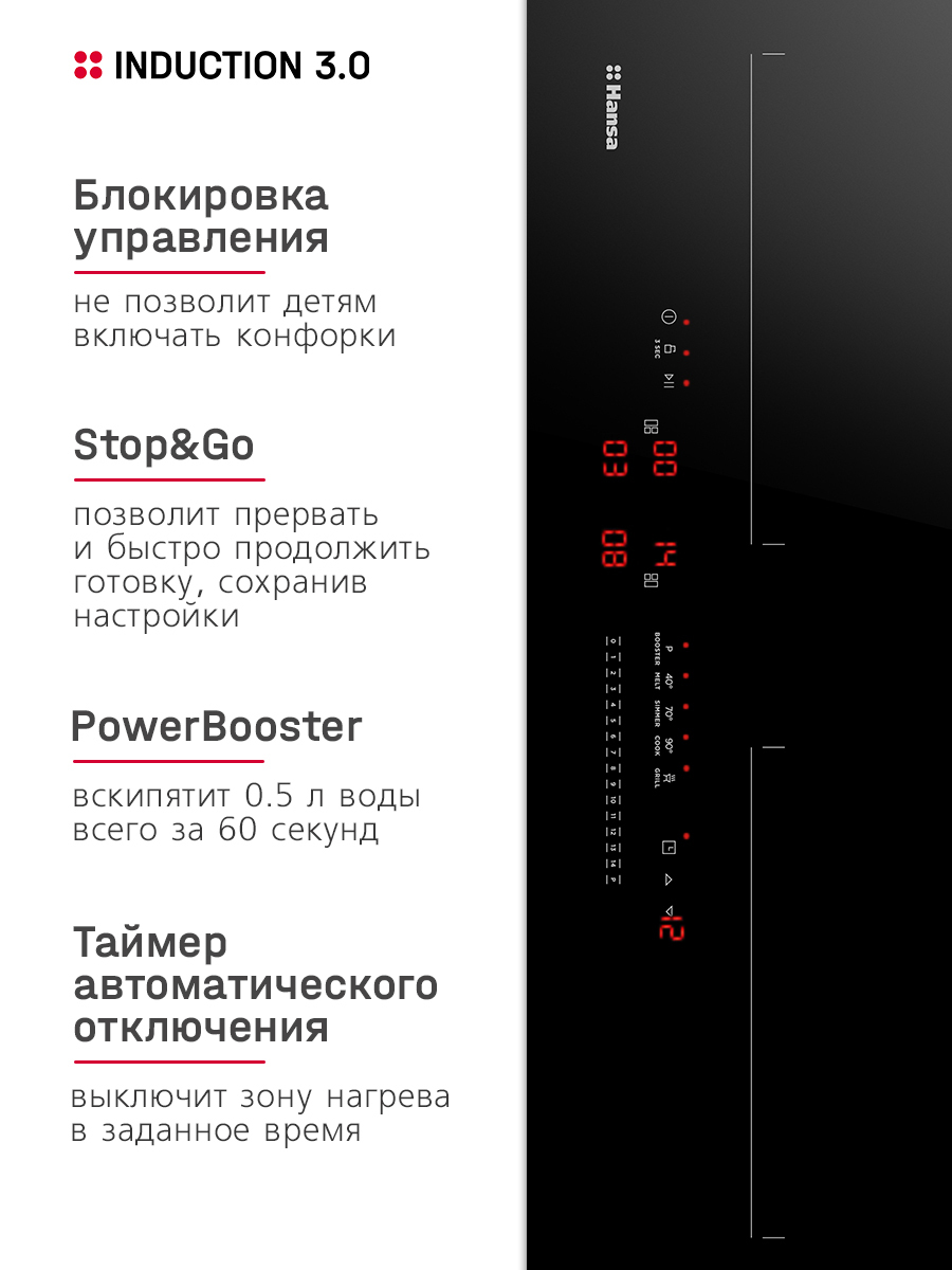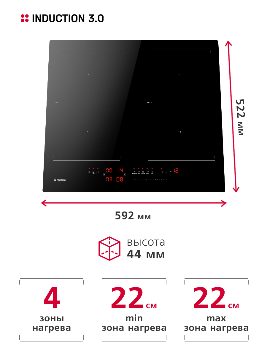 Размер (Высота) 4,9 см Размер (Глубина) 52,2 см Размер (Ширина) 59,2 см Цвет черный Ширина прибора 60 см Переключатели сенсорные Управление сенсорый слайдер Таймер есть Защита от детей есть Мощность подключения, Вт 7350 Фурнитура нет Гарантийный срок (месяцы) 12 Страна производитель Польша Ссылка на сайт производителя https://hansa.ru/product/indukcionnaya-varochnaya-poverhnost-hansa-bhi67906-chernyy?variant_id=709254565 Всего конфорок 4 Рабочая поверхность стеклокерамика Количество индукционных конфорок 4 Тип поверхности индукционная Встроенная вытяжка нет Расположение панели управления спереди Зона расширения Bridge zone, 2 Функция Booster есть Дизайн рамки без рамки Размер в упаковке (Высота) 13 см Размер в упаковке (Ширина) 70 см Размер в упаковке (Глубина) 62 см Вес прибора 7,65 кг Размер (Ширина), см 59,2 Размер (Высота), см (Общие) 4,9 Размер (Глубина), см 52,2 - Отзывы