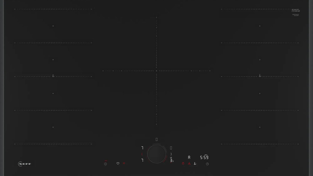 Описаниеповерхность варочная стеклокерамическая индукционная, 93 см, черный, Flex Design, профили и Twistpad не входят в комплект, приобретаются в качестве обязательных аксессуаров в 4 цветах по вашему выбору, 2 зоны FlexInduction + 1 выдвижная центральная зона, HomeConnect, управление вытяжкой, 11 уровней расширенного датчика жарки, управление питанием