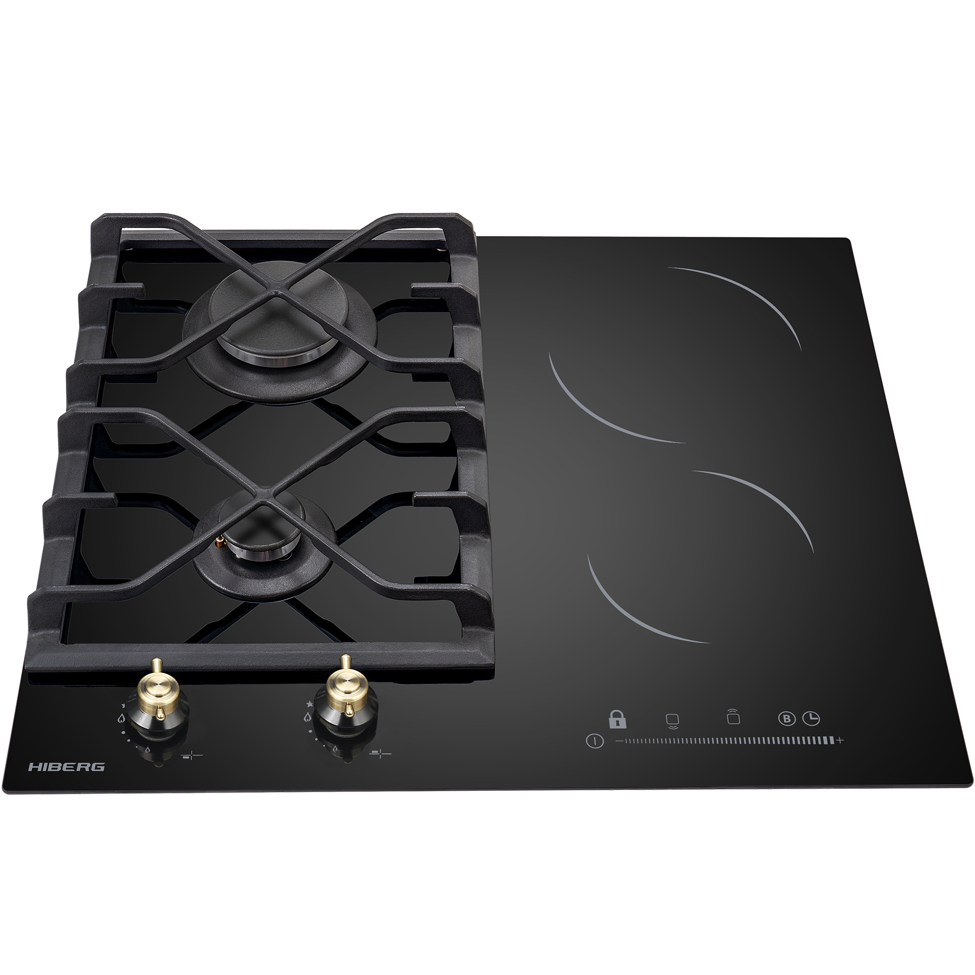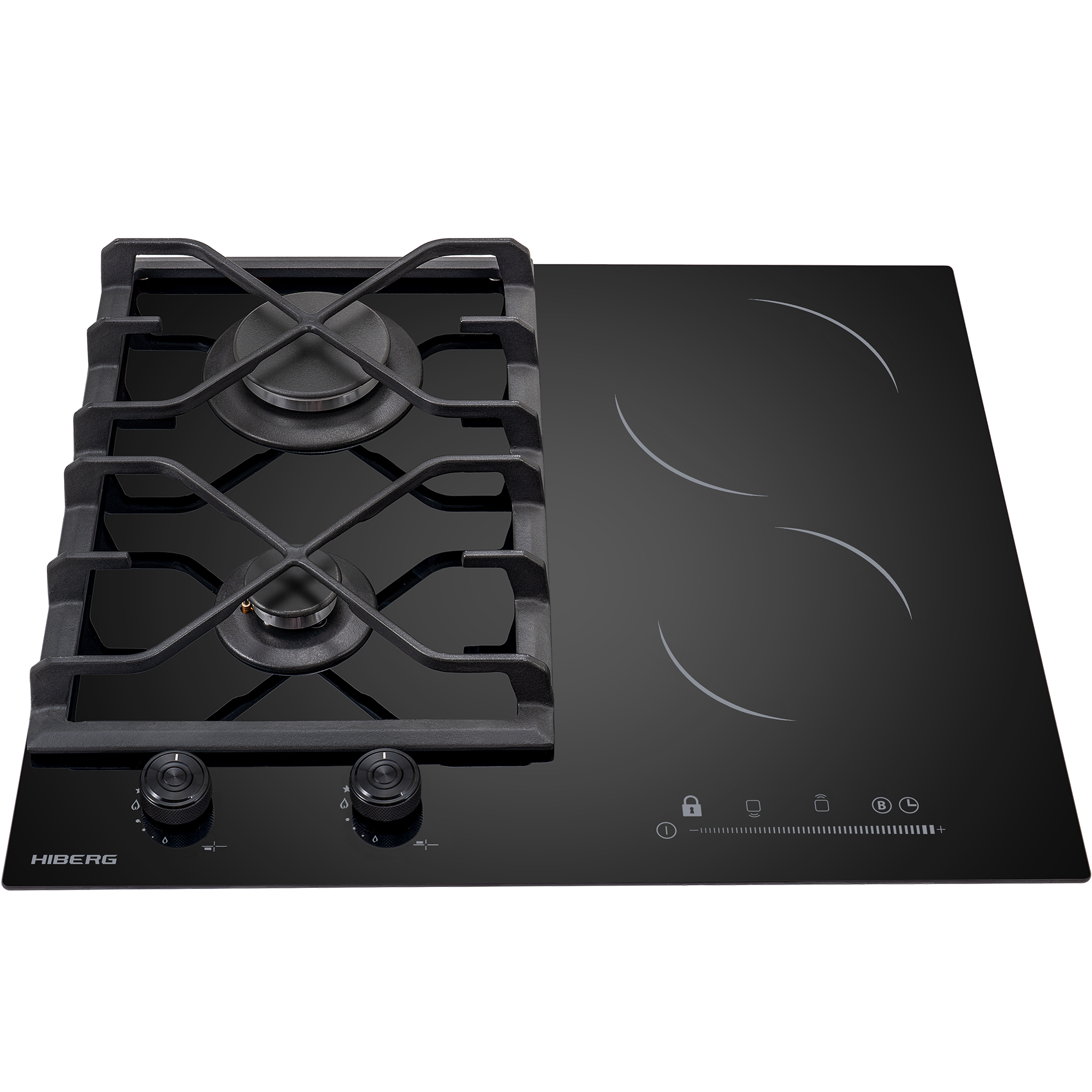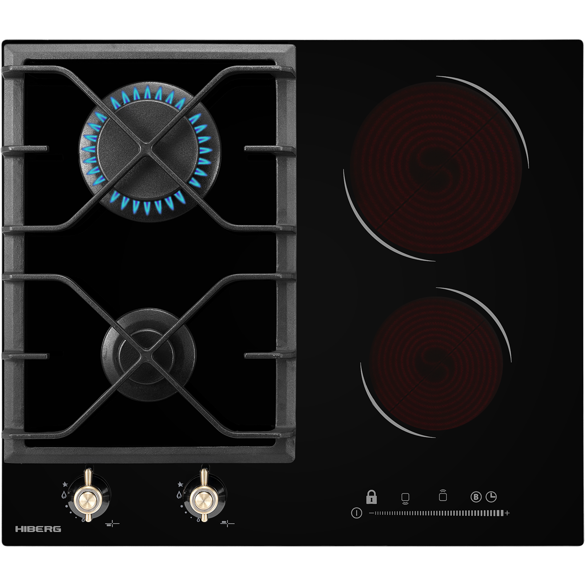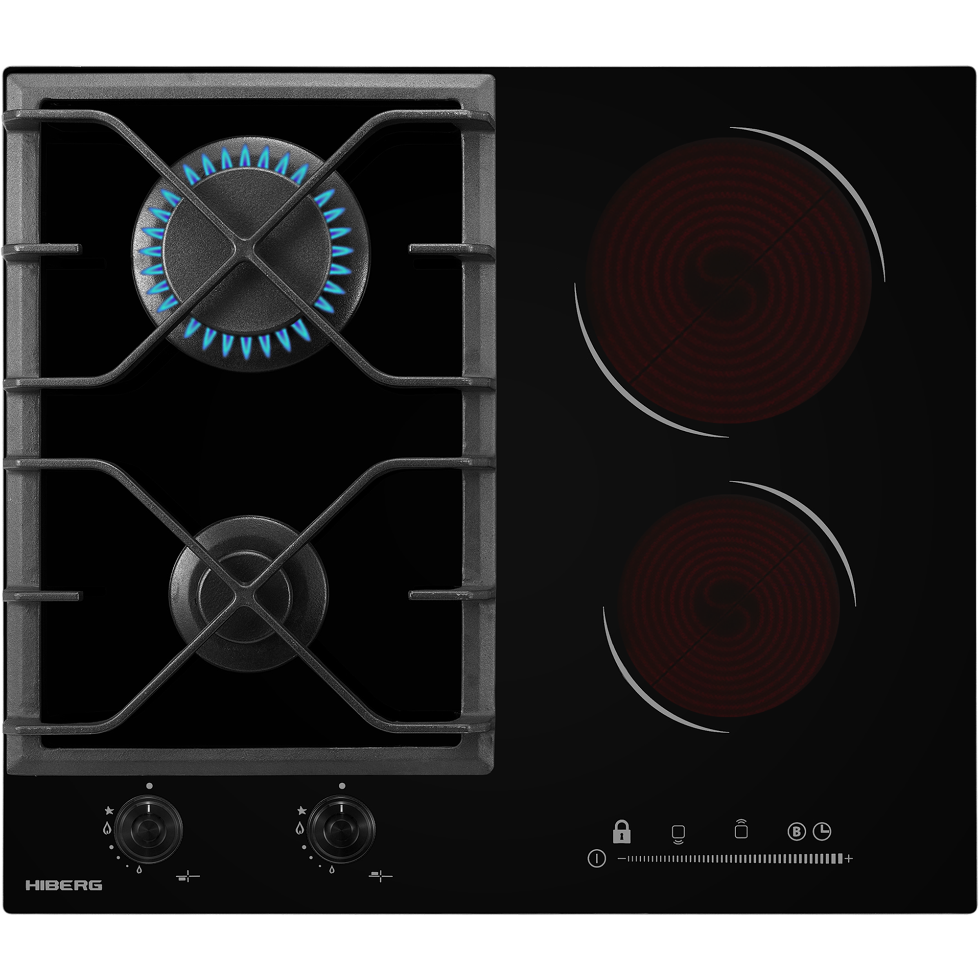 Описаниеповерхность варочная комбинированная независимая, 60 см, 4 конфорки (2 - газовых, 2 - HiLight), решетки чугунные, черный